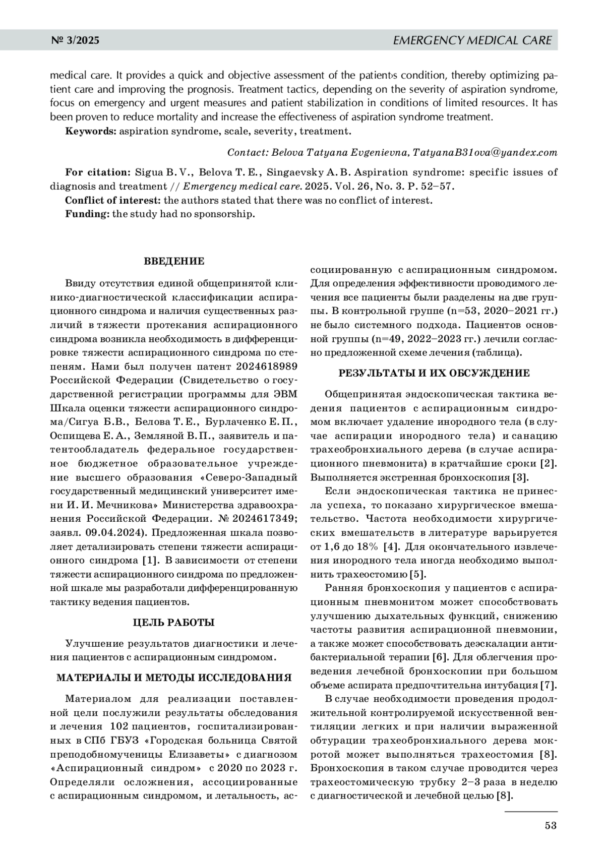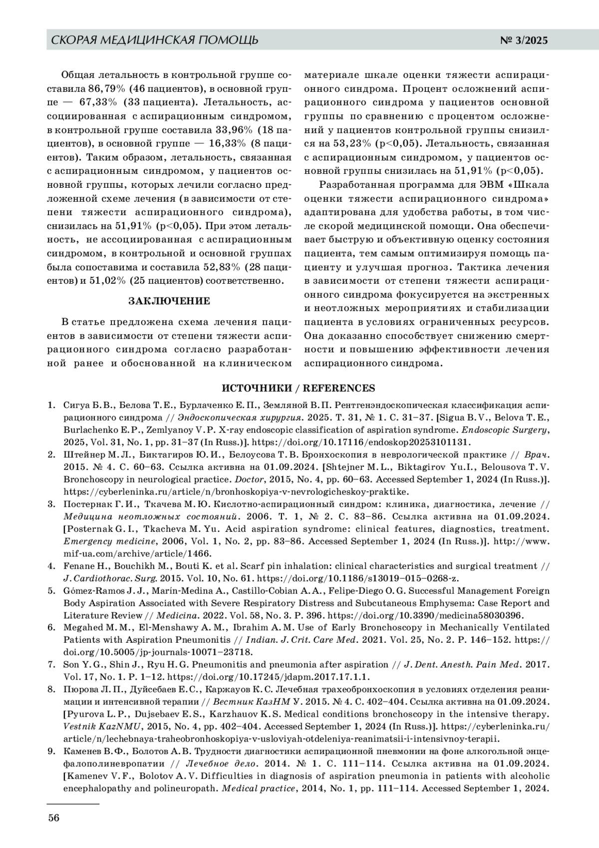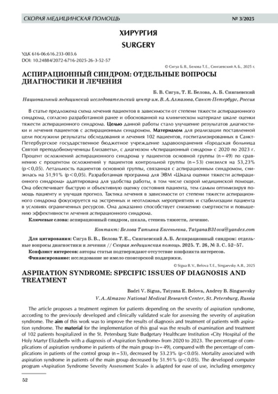 В статье предложена схема лечения пациентов в зависимости от степени тяжести аспирационного синдрома, согласно разработанной ранее и обоснованной на клиническом материале шкале оценки тяжести аспирационного синдрома. Целью данной работы стало улучшение результатов диагностики и лечения пациентов с аспирационным синдромом. Материалом для реализации поставленной цели послужили результаты обследования и лечения 102 пациентов, госпитализированных в СанктПетербургское государственное бюджетное учреждение здравоохранения «Городская больница Святой преподобномученицы Елизаветы», с диагнозом «Аспирационный синдром» с 2020 по 2023 г. Процент осложнений аспирационного синдрома у пациентов основной группы (n=49) по сравнению с процентом осложнений у пациентов контрольной группы (n=53) снизился на 53,23% (р<0,05). Летальность пациентов основной группы, связанная с аспирационным синдромом, снизилась на 51,91% (р<0,05). Разработанная программа для ЭВМ «Шкала оценки тяжести аспирационного синдрома» адаптирована для удобства работы, в том числе скорой медицинской помощи. Она обеспечивает быструю и объективную оценку состояния пациента, тем самым оптимизируя помощь пациенту и улучшая прогноз. Тактика лечения в зависимости от степени тяжести аспирационного синдрома фокусируется на экстренных и неотложных мероприятиях и стабилизации пациента в условиях ограниченных ресурсов. Она доказанно способствует снижению смертности и повышению эффективности лечения аспирационного синдрома.