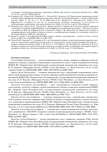 36. 	Скворцов А.Е., Резник О. Н., Комедев С. С., Теплов В. М., Багненко С. Ф. Перспективы применения экстра-корпоральной мембранной оксигенации в практике сердечно-легочной реанимации // Скорая медицинская помощь. 2018. Т. 19, № 1. С. 72-76.