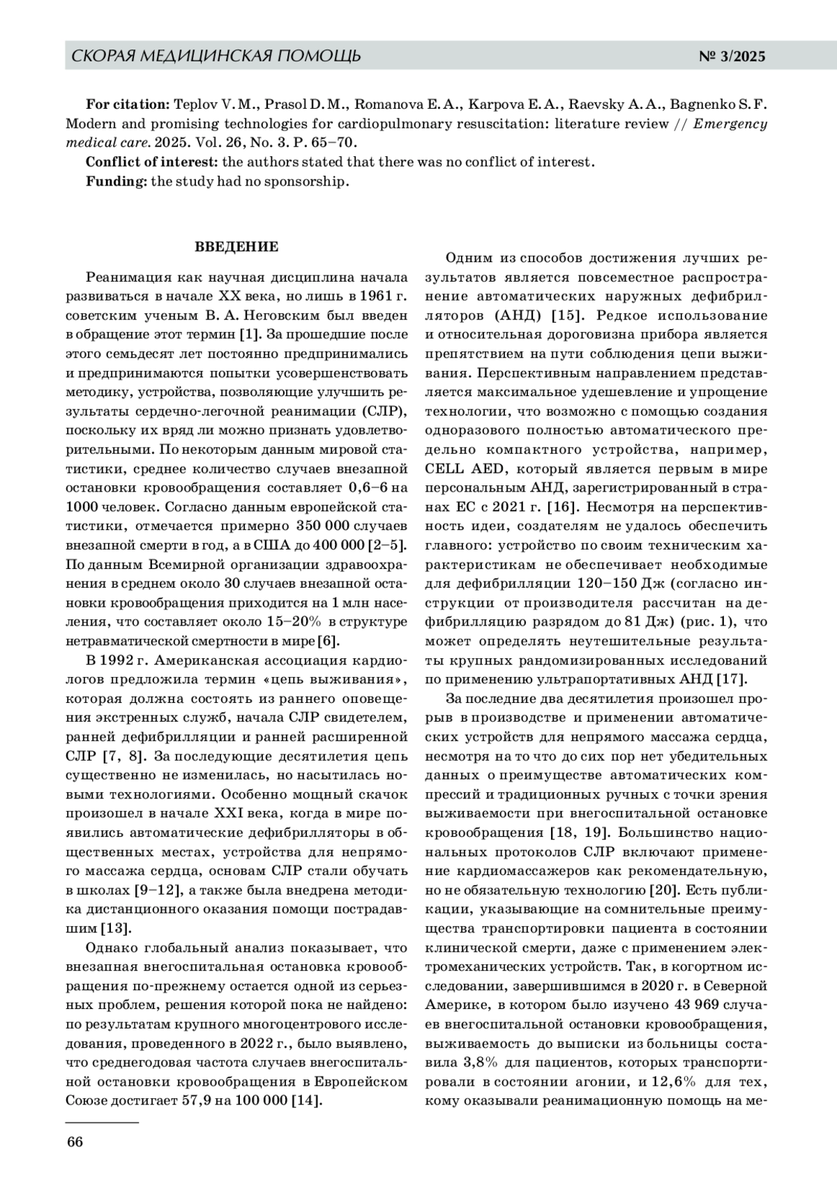 Реанимация как научная дисциплина начала развиваться в начале ХХ века, но лишь в 1961 г. советским ученым В. А. Неговским был введен в обращение этот термин [1]. За прошедшие после этого семьдесят лет постоянно предпринимались и предпринимаются попытки усовершенствовать методику, устройства, позволяющие улучшить результаты сердечно- легочной реанимации (СЛР), поскольку их вряд ли можно признать удовлетворительными. По некоторым данным мировой статистики, среднее количество случаев внезапной остановки кровообращения составляет 0,6–6 на 1000 человек. Согласно данным европейской статистики, отмечается примерно 350 000 случаев внезапной смерти в год, а в США до 400 000 [2–5]. По данным Всемирной организации здравоохранения в среднем около 30 случаев внезапной остановки кровообращения приходится на 1 млн населения, что составляет около 15–20% в структуре нетравматической смертности в мире [6].