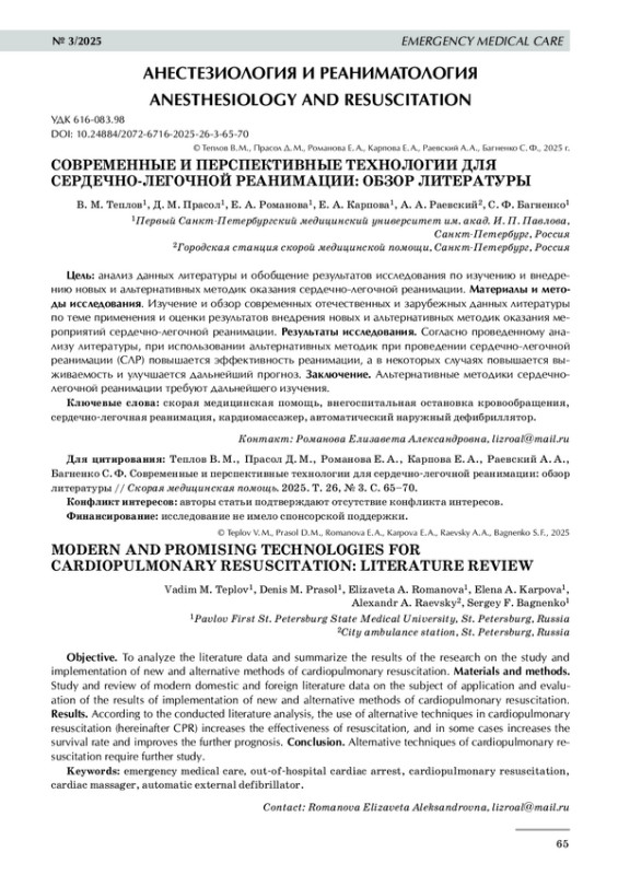 23. 	Теплов В.М., Прасол Д. М., Романова Е. А. и др. Доклинические испытания отечественных устройств, применяемых при внегоспитальной остановке кровообращения // Медицина катастроф. 2024. № 3. С. 61-64.