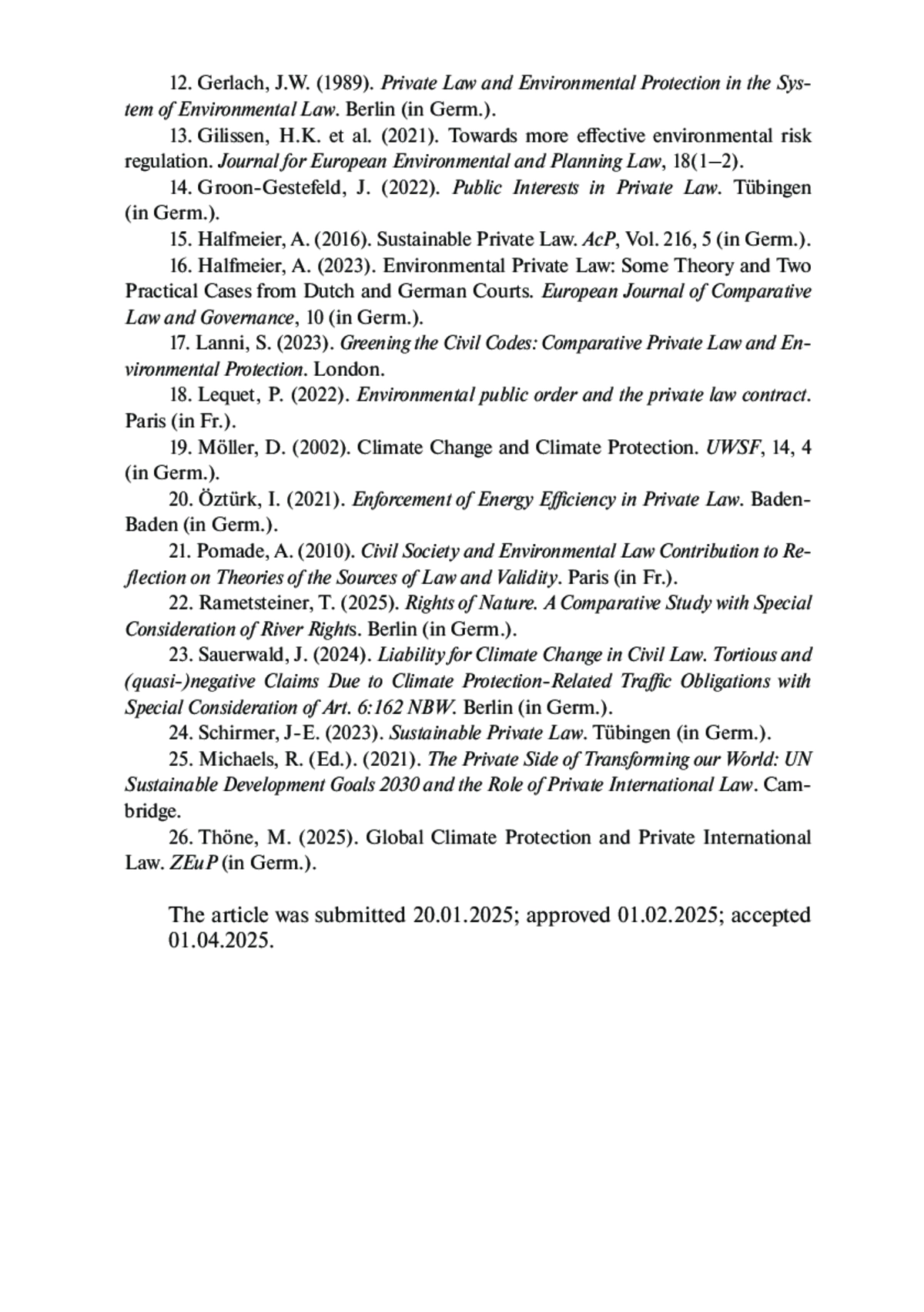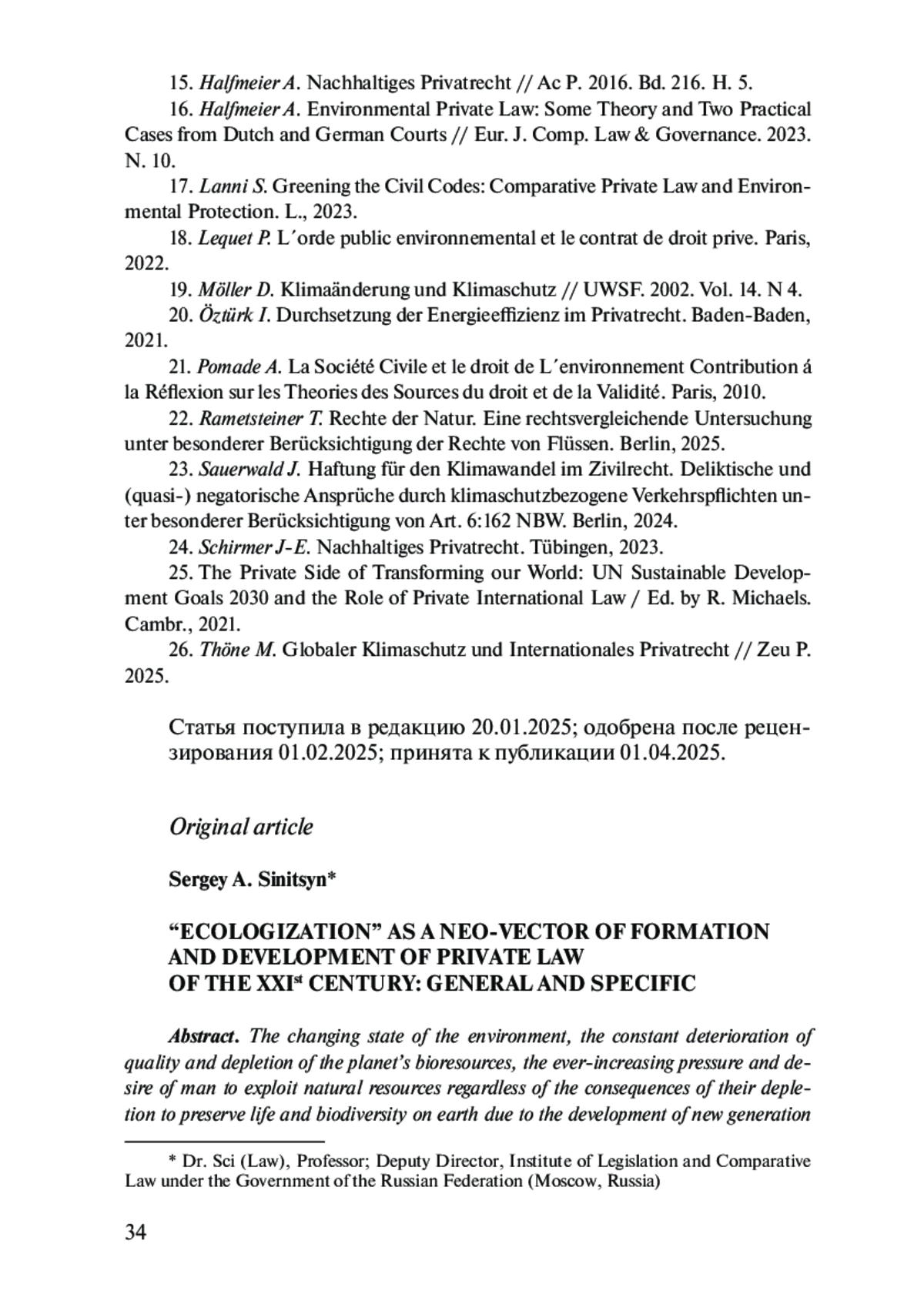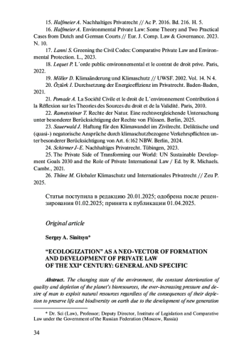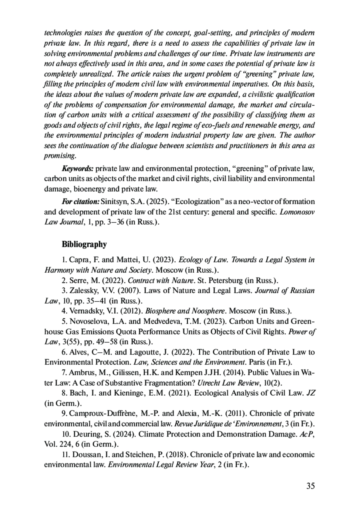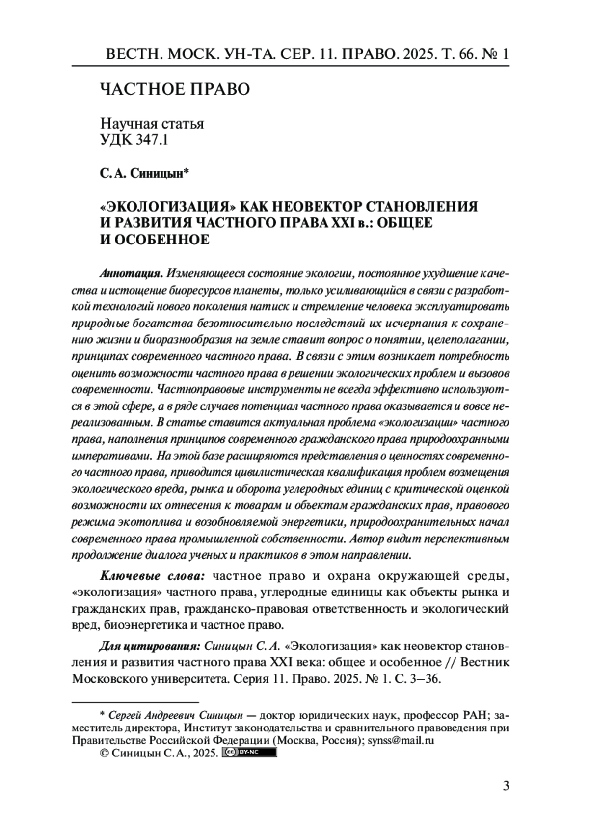 СИНИЦЫН С. А. «ЭКОЛОГИЗАЦИЯ» КАК НЕОВЕКТОР СТАНОВЛЕНИЯ И РАЗВИТИЯ ЧАСТНОГО ПРАВА XXI В.: ОБЩЕЕ И ОСОБЕННОЕ // ВЕСТНИК МОСКОВСКОГО УНИВЕРСИТЕТА. СЕРИЯ 11: ПРАВО. 2025. № 1