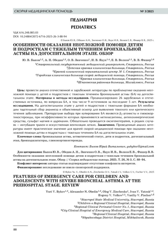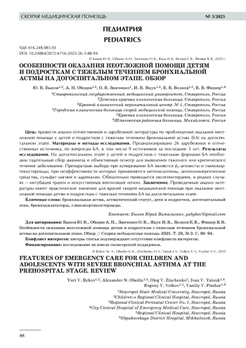 Bykov Yu.V., Obidin A. N., Muravyeva A. A. et al.Intensive therapy of asthmatic status in pediatric practice. Innovative medicine of Kuban, 2025, No. 1, pp. 128-135 (In Russ.).