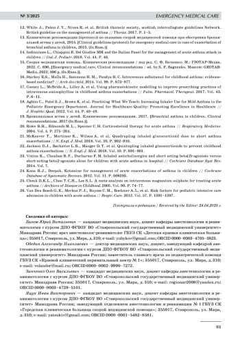 6. 	Morris I., Lyttle M. D., O›Sullivan R. et al. Which intravenous bronchodilators are being administered to children presenting with acute severe wheeze in the UK and Ireland? // Thorax. 2015. Vol. 70. P. 88-91.