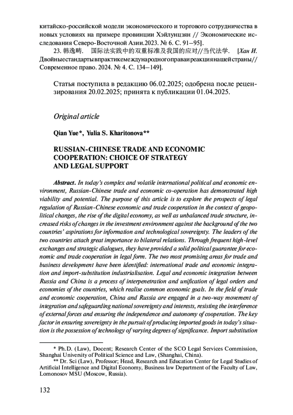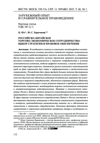 В сегодняшних сложных и изменчивых международных политических и экономических условиях российско-китайского торгово-экономическое сотрудничество продемонстрировало высокую жизнеспособность и потенциал. Целью данной статьи является изучение перспектив правового регулирования российско-китайского экономического и торгового сотрудничества в условиях геополитических изменений, подъема цифровой экономики, а также несбалансированной структуры торговли, повышенных рисков изменений в инвестиционной среде на фоне стремления двух стран к информационному и технологическому суверенитету. Руководство двух стран придает большое значение двусторонним отношениям. Благодаря частым обменам мнениями на высоком уровне и стратегическим диалогам они обеспечили надежную политическую гарантию для экономического и торгового сотрудничества, облеченного в правовую форму. Выделены два наиболее перспективных в плане развития торговли и предпринимательской деятельности направления: международная торгово-экономическая интеграция и импортозамещающая индустриализация. Правовая и экономическая интеграция России и Китая является процессом взаимопроникновения и объединения правопорядков и экономик стран, которые реализуют общие экономические цели. В сфере торгово-экономического сотрудничества Китай и Россия участвуют в двустороннем движении интеграции и обеспечения национального суверенитета и интересов, противодействуя вмешательству внешних сил и обеспечивая независимость и автономию сотрудничества. Ключевым фактором обеспечения суверенитета в стремлении производить импортные товары в сегодняшней ситуации становится обладание технологиями разной степени значимости. Импортозамещение является важным фактором обеспечения суверенитета за счет снижения зависимости экономики от внешних поставок.