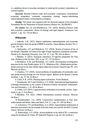 22. 为例//东北亚经济研究 [Цинь Ч., Лю Ц. Направление и траектория развития китайско-российской модели экономического и торгового сотрудничества в новых условиях на примере провинции Хэйлунцзян // Экономические исследования Северо-Восточной Азии.2023. № 6. C. 91-95].
