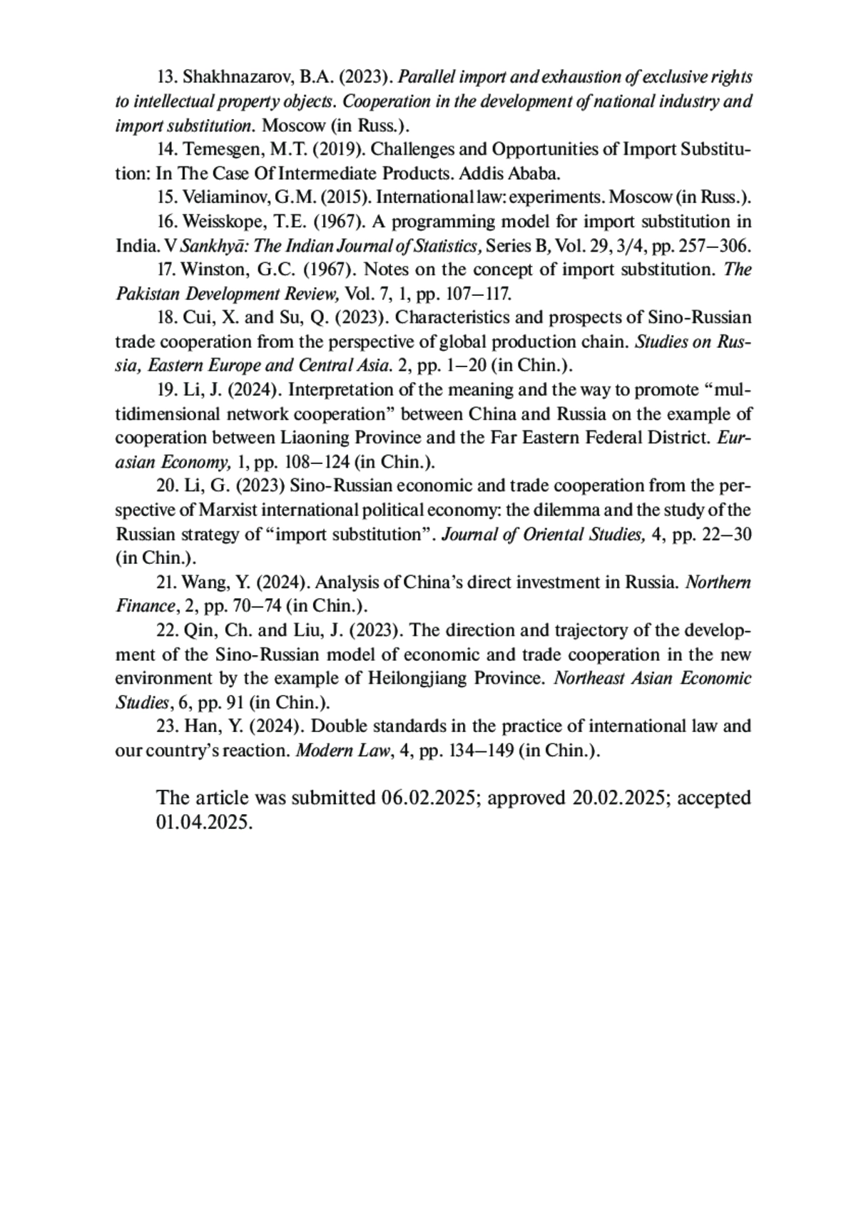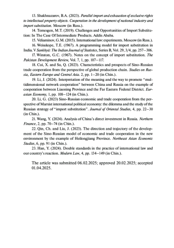 19. 李冠群.马克思主义国际政治经济学视域下的中俄经贸合作 俄罗斯“进口替代“战略的困境与探索//东方学刊 [Ли Г. Китайско-российское экономическое и торговое сотрудничество с точки зрения марксистской международной политической экономии: дилемма и исследование российской стратегии “импортозамещения” // Журнал востоковедения. 2023. № 4. C. 22-30].