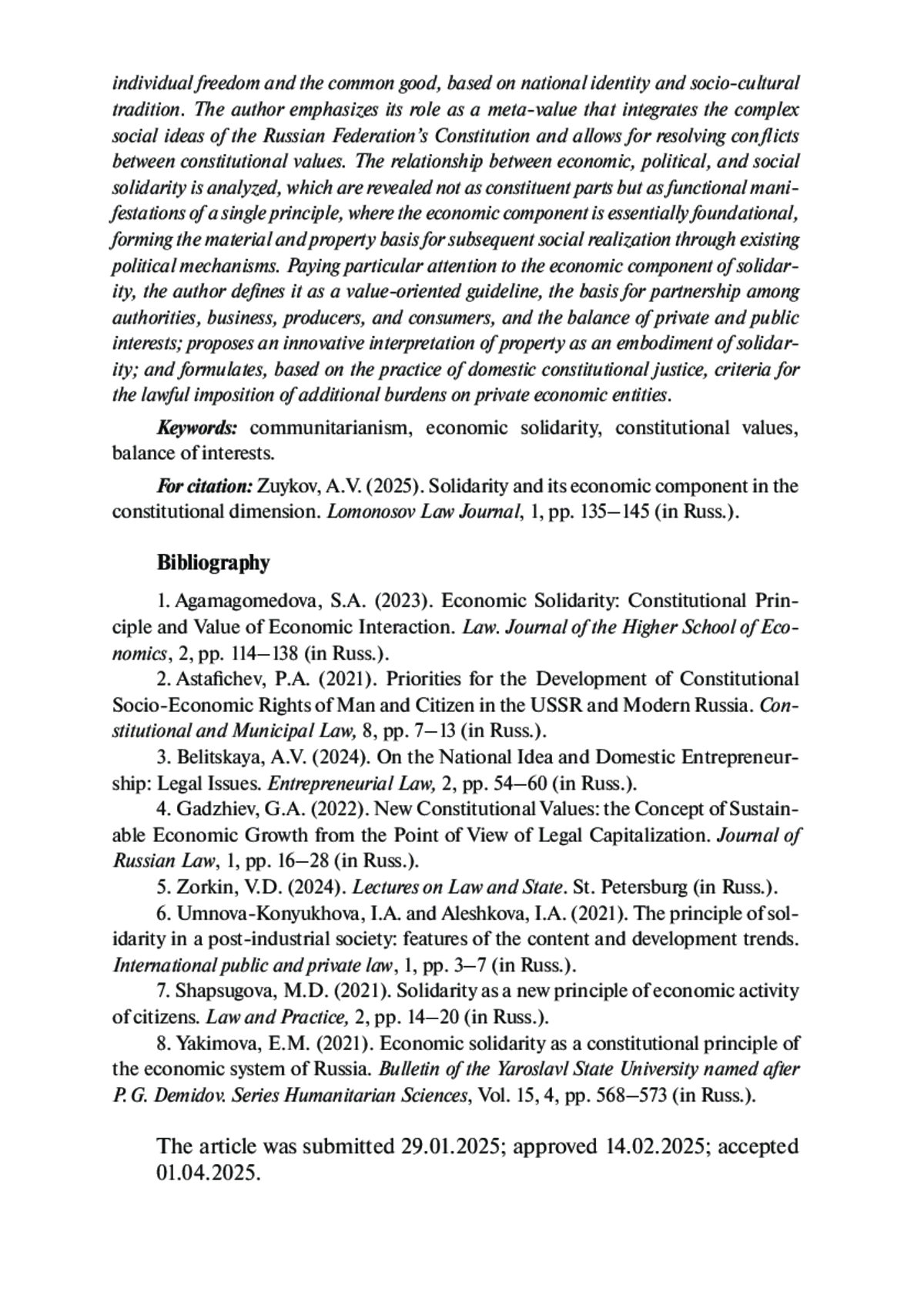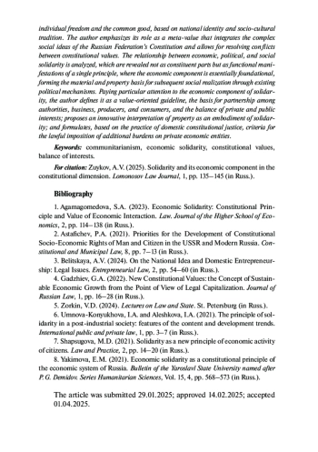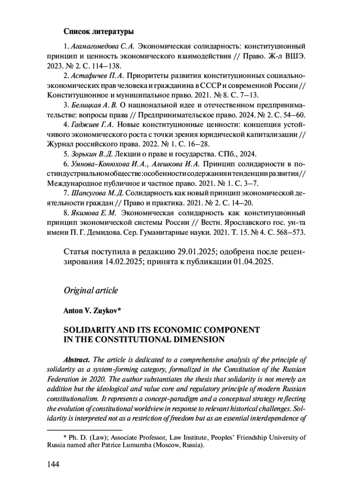 1. Агамагомедова С. А. Экономическая солидарность: конституционный принцип и ценность экономического взаимодействия // Право. Ж-л ВШЭ.2023. № 2. С. 114-138.