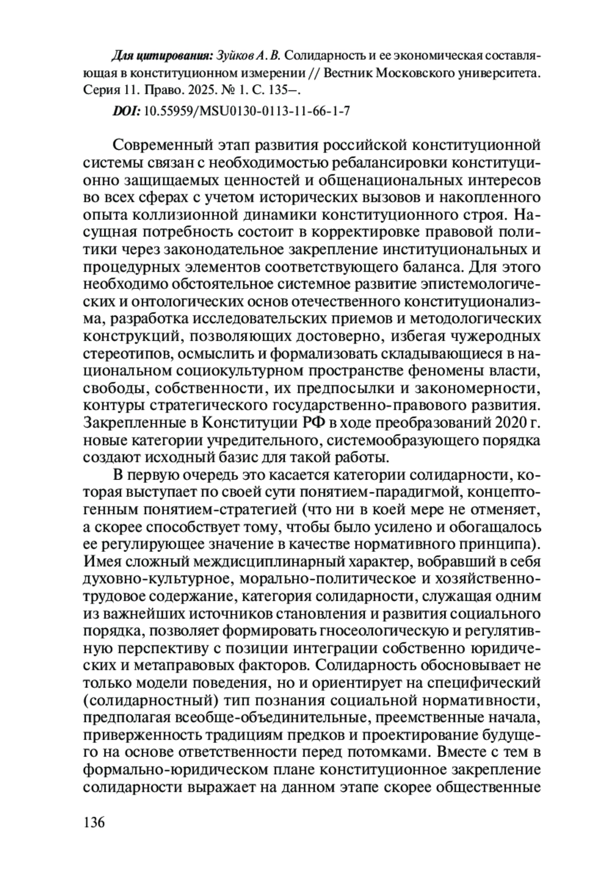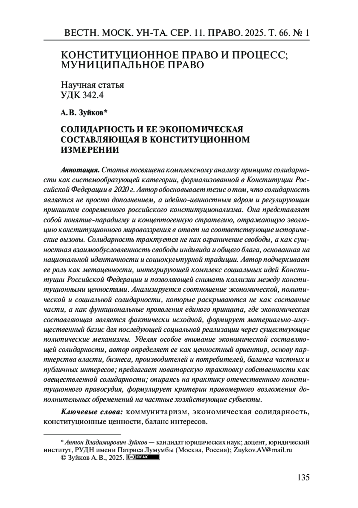 Статья посвящена комплексному анализу принципа солидарности как системообразующей категории, формализованной в Конституции Российской Федерации в 2020 г. Автор обосновывает тезис о том, что солидарность является не просто дополнением, а идейно-ценностным ядром и регулирующим принципом современного российского конституционализма. Она представляет собой понятие-парадигму и концептогенную стратегию, отражающую эволюцию конституционного мировоззрения в ответ на соответствующие исторические вызовы. Солидарность трактуется не как ограничение свободы, а как сущностная взаимообусловленность свободы индивида и общего блага, основанная на национальной идентичности и социокультурной традиции. Автор подчеркивает ее роль как метаценности, интегрирующей комплекс социальных идей Конституции Российской Федерации и позволяющей снимать коллизии между конституционными ценностями. Анализируется соотношение экономической, политической и социальной солидарности, которые раскрываются не как составные части, а как функциональные проявления единого принципа, где экономическая составляющая является фактически исходной, формирует материально-имущественный базис для последующей социальной реализации через существующие политические механизмы. Уделяя особое внимание экономической составляющей солидарности, автор определяет ее как ценностный ориентир, основу партнерства власти, бизнеса, производителей и потребителей, баланса частных и публичных интересов; предлагает новаторскую трактовку собственности как овеществленной солидарности; опираясь на практику отечественного конституционного правосудия, формулирует критерии правомерного возложения дополнительных обременений на частные хозяйствующие субъекты.