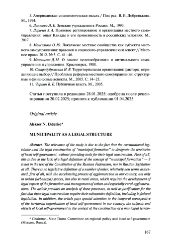 7. Ларичев А. А. Правовое регулирование и организация местного самоуправления: опыт Канады и его применимость в российских условиях. М., 2017. EDN: YVMQQX
