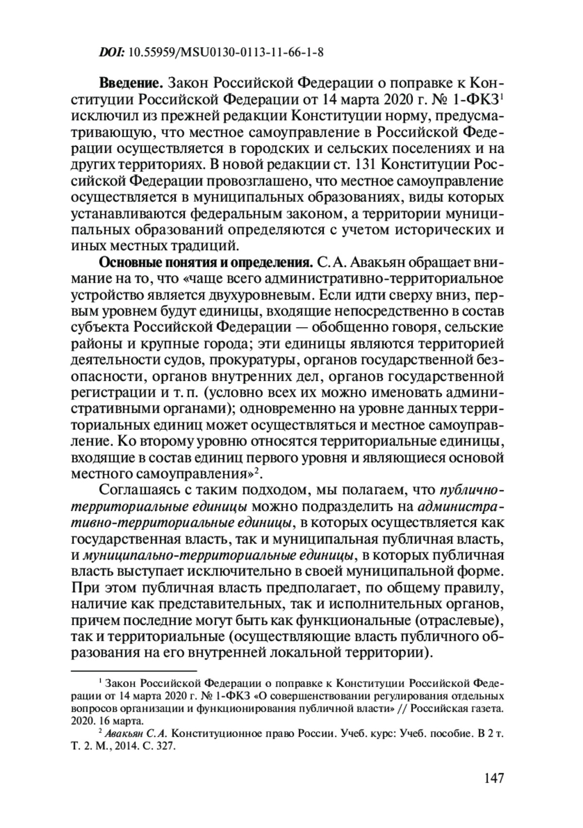 Закон Российской Федерации о поправке к Конституции Российской Федерации от 14 марта 2020 г. № 1-ФКЗ 1 исключил из прежней редакции Конституции норму, предусматривающую, что местное самоуправление в Российской Федерации осуществляется в городских и сельских поселениях и на других территориях.