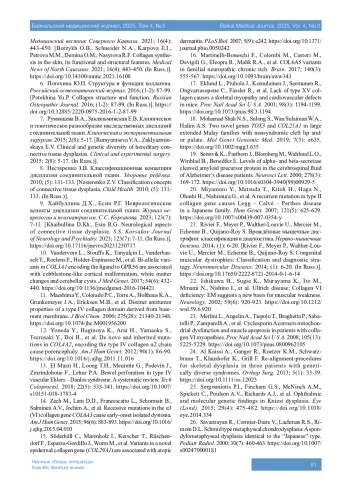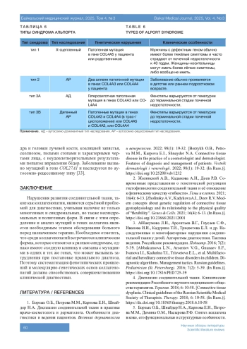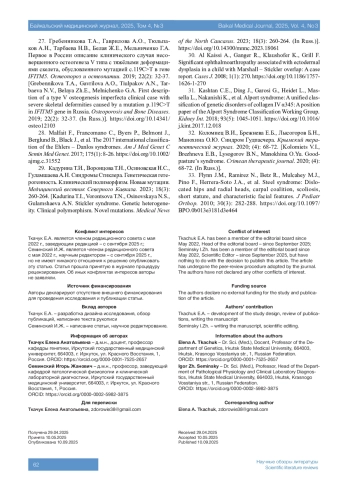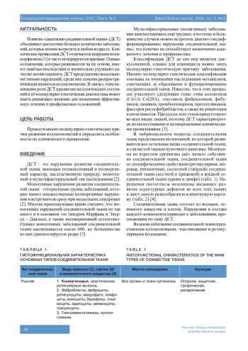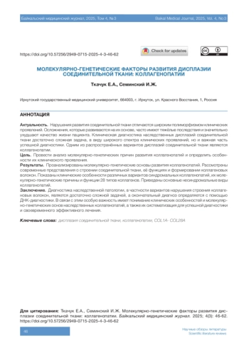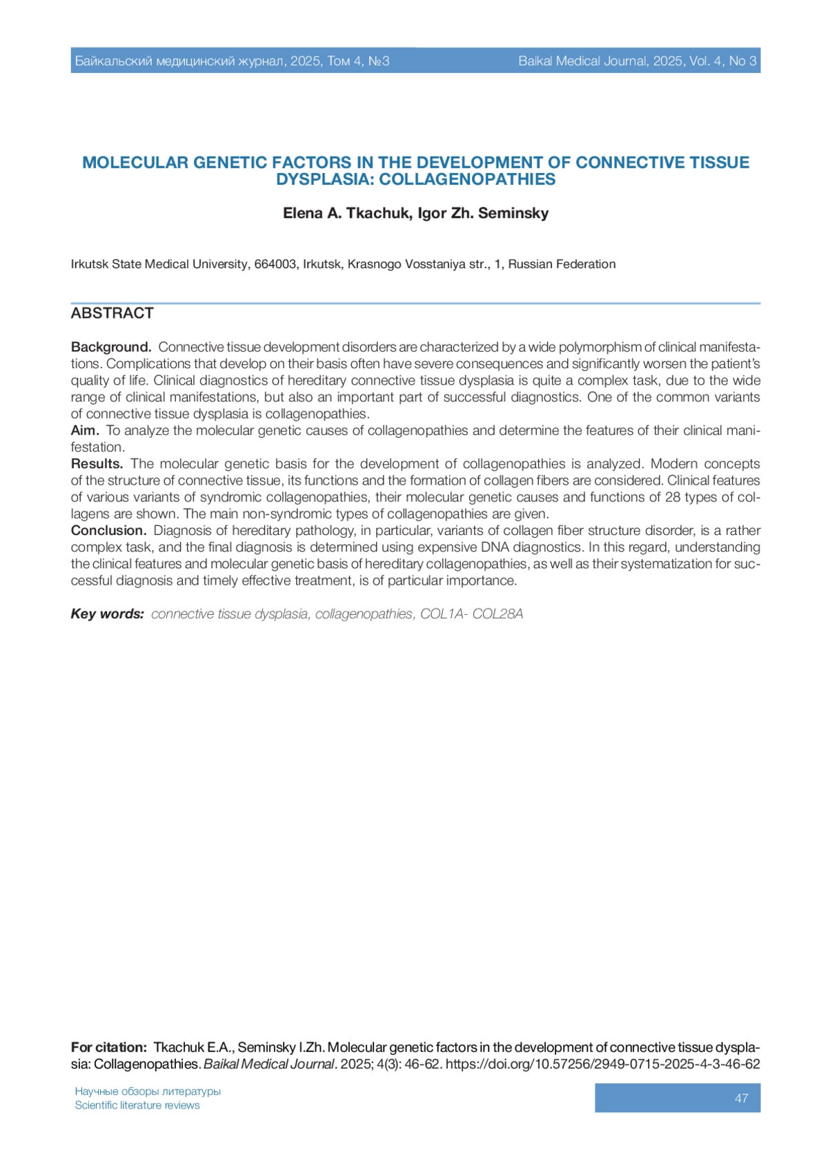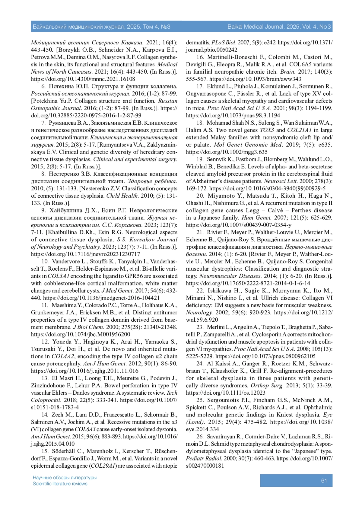 Заключение. Диагностика наследственной патологии, в частности вариантов нарушения строения коллагеновых волокон, является достаточно сложной задачей, а окончательный диагноз определяется с помощью ДНК-диагностики. В связи с этим особую важность имеет понимание клинических особенностей и молекулярно-генетических основ наследственных коллагенопатий, а также их систематизация для успешной диагностики и своевременного эффективного лечения.
