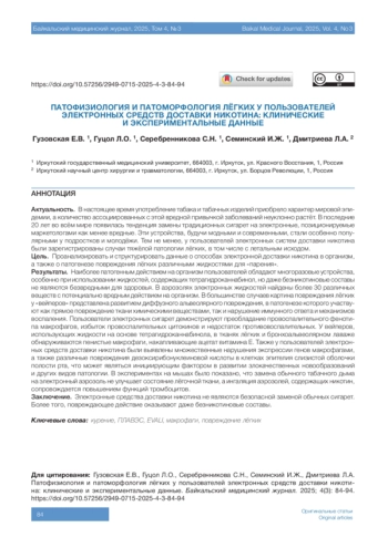Актуальность. В настоящее время употребление табака и табачных изделий приобрело характер мировой эпидемии, а количество ассоциированных с этой вредной привычкой заболеваний неуклонно растёт. В последние 20 лет во всём мире появилась тенденция замены традиционных сигарет на электронные, позиционируемые маркетологами как менее вредные. Эти устройства, будучи модными и современными, стали особенно популярными у подростков и молодёжи. Тем не менее, у пользователей электронных систем доставки никотина были зарегистрированы случаи тяжёлой патологии лёгких, в том числе с летальным исходом.