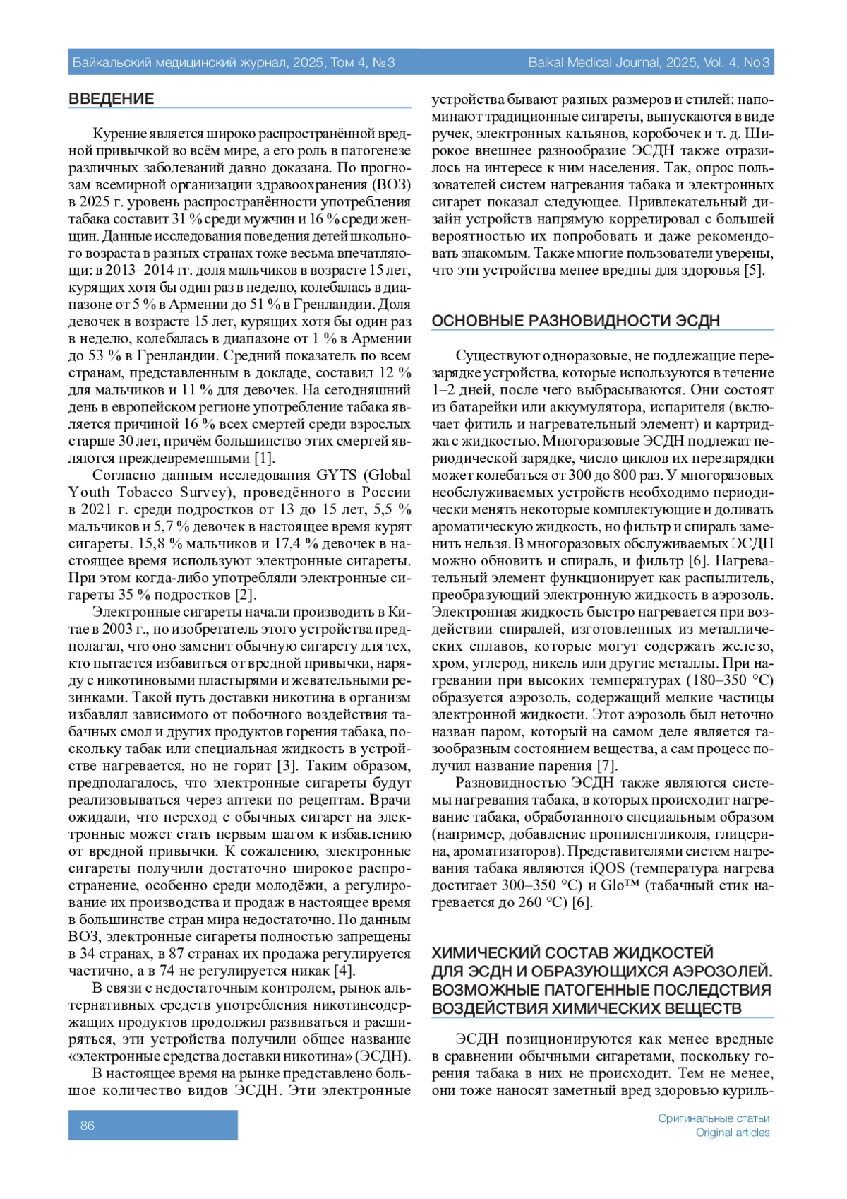 Цель. Проанализировать и структурировать данные о способах электронной доставки никотина в организм, а также о патогенезе повреждения лёгких различными жидкостями для «парения».
