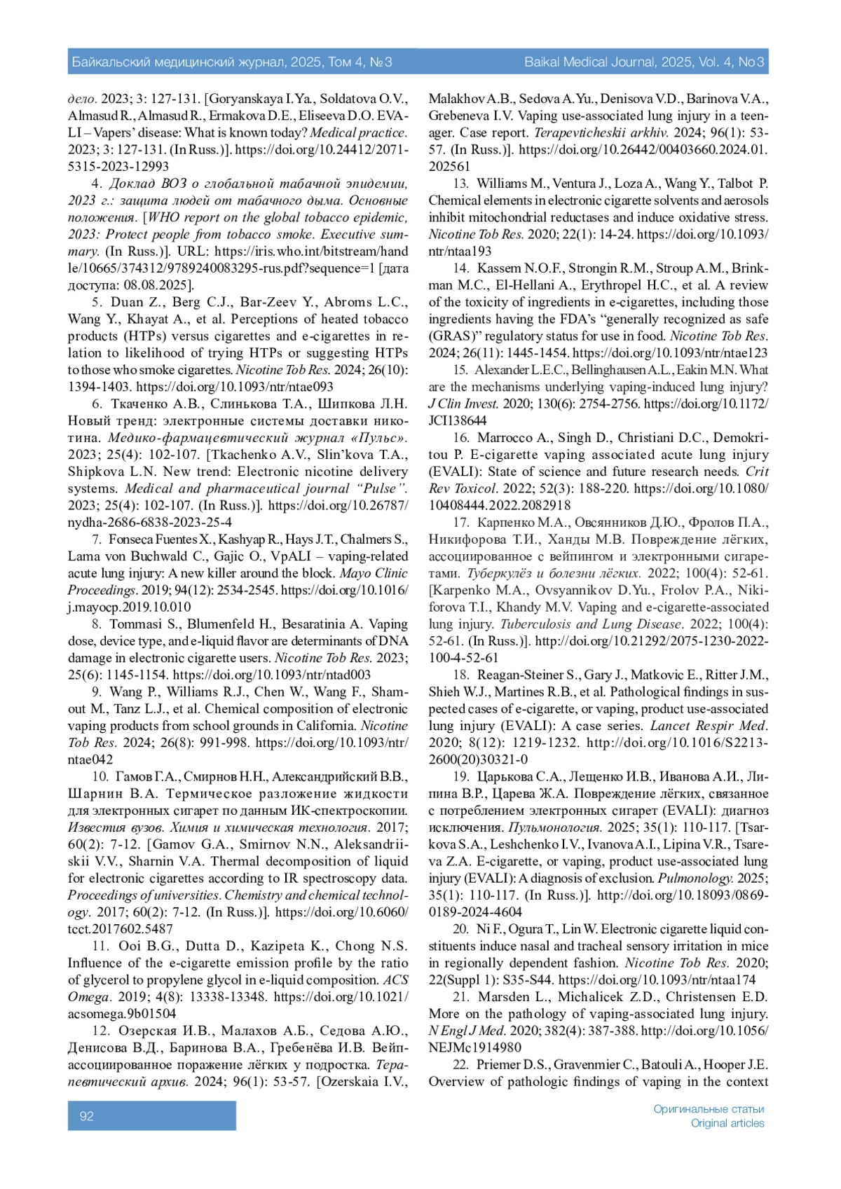 3. 	Горянская И.Я., Солдатова О.В., Алмасуд Р. и др. EVALI - болезнь вейперов: что известно на сегодняшний день? Лечебное дело. 2023;3:127-131. DOI: 10.24412/2071-5315-2023-12993
