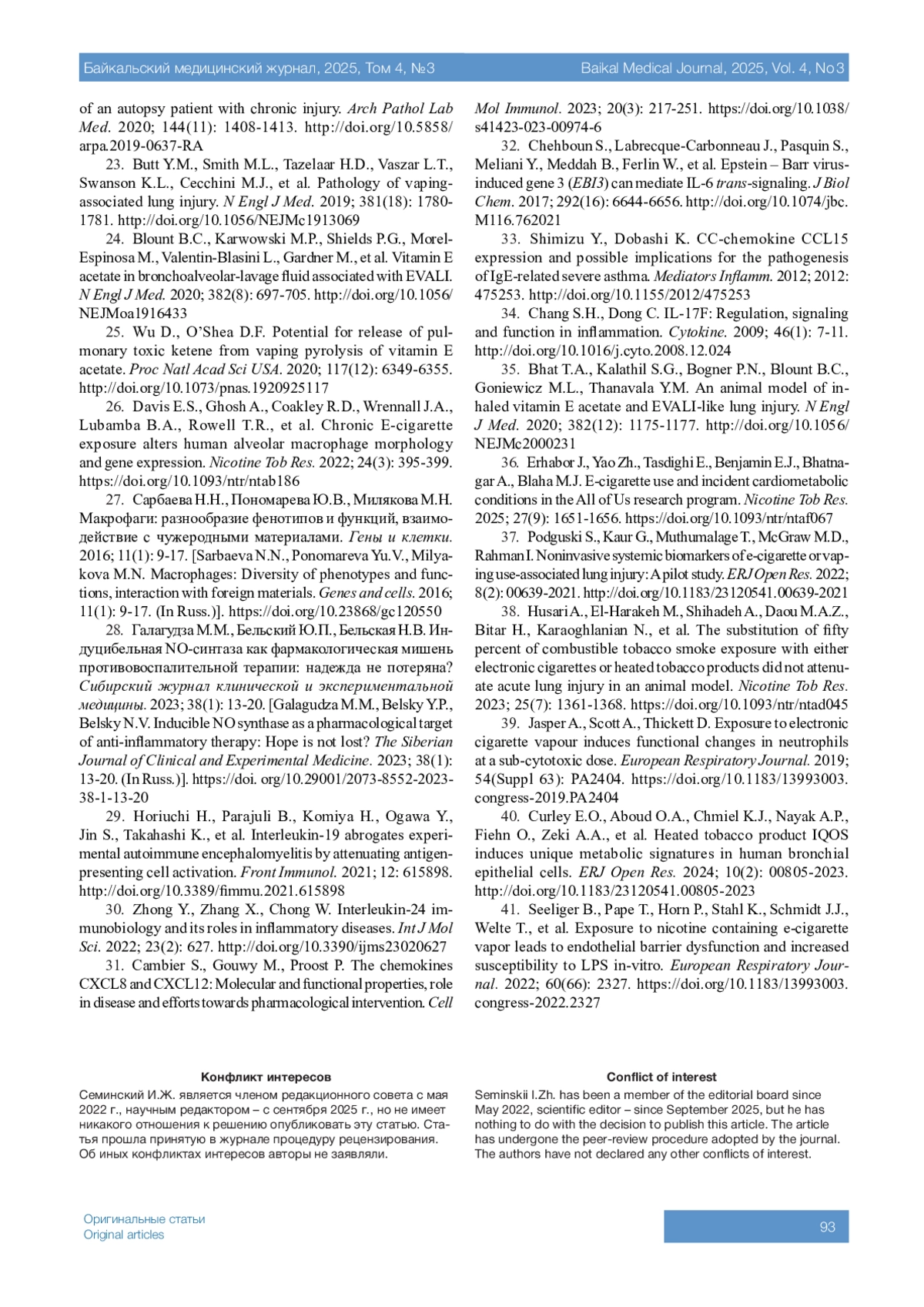 17. 	Карпенко М. А., Овсянников Д. Ю., Фролов П. А. и др. Повреждение легких, ассоциированное с вейпингом и электронными сигаретами. Туберкулёз и болезни лёгких. 2022;100(4):52-61. DOI: 10.21292/2075-1230-2022-100-4-52-61 18. 	Reagan-Steiner S., Gary J., Matkovic E. et al. Pathological findings in suspected cases of e-cigarette, or vaping, product use-associated lung injury (EVALI): a case series. Lancet Respir Med. 2020;8(12):1219-1232. DOI: 10.1016/S2213-2600(20)30321-0