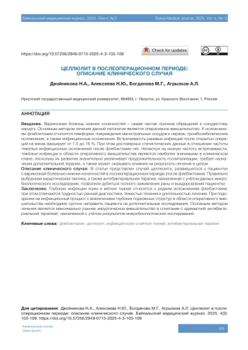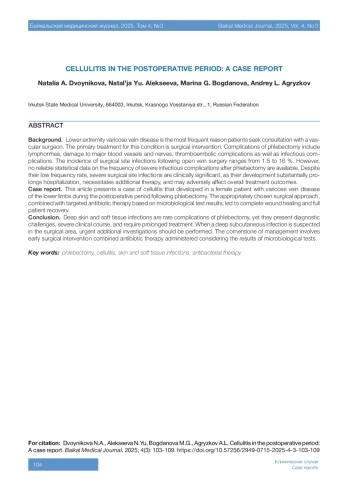 Описание клинического случая. В статье представлен случай целлюлита, развившегося у пациентки с варикозной болезнью нижних конечностей в послеоперационном периоде (после флебэктомии). Правильно выбранная хирургическая тактика, а также антибактериальная терапия, назначенная с учётом данных микробиологического исследования, позволили добиться полного заживления раны и выздоровления пациентки.
