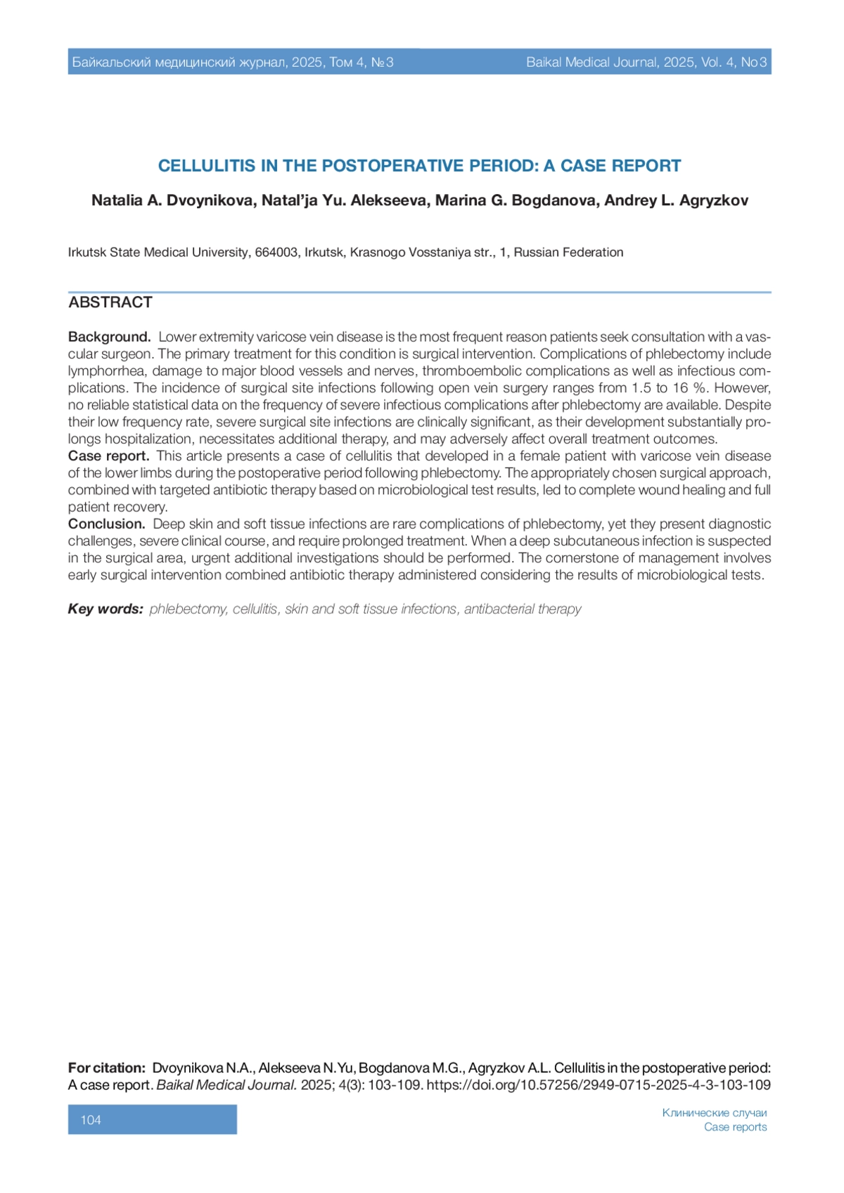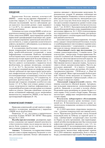 Введение. Варикозная болезнь нижних конечностей – самая частая причина обращений к сосудистому хирургу. Основным методом лечения данной патологии является оперативное вмешательство. К осложнениям флебэктомии относятся лимфорея, повреждения магистральных сосудов и нервов, тромбоэмболические осложнения, а также инфекционные осложнения. Встречаемость раневых инфекций после открытых операций на венах варьирует от 1,5 до 16 %. При этом достоверных статистических данных в отношении частоты тяжёлых инфекционных осложнений после флебэктомии нет. Несмотря на низкую частоту встречаемости, тяжёлые инфекции в области оперативного вмешательства являются наиболее значимыми в клиническом плане, поскольку их развитие значительно увеличивает продолжительность госпитализации, требует назначения дополнительной терапии, а также может оказывать влияние на результаты лечения в целом.