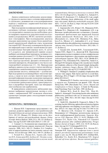 Заключение. Глубокие инфекции кожи и мягких тканей относятся к редким осложнениям флебэктомии, при этом отличаются трудностью ранней диагностики, тяжестью течения и длительностью лечения. При подозрении на инфекционный процесс с вовлечением глубоких подкожных структур в области оперативного вмешательства необходимо срочно направить пациента на дополнительные исследования. Основным методом лечения является максимально раннее хирургическое вмешательство в сочетании с адекватной антибактериальной терапией, назначенной с учётом результатов микробиологических исследований.