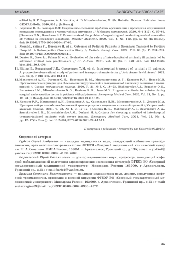 10. Denton G., Green L., Palmer M. et al. Evaluation of the safety of inter-hospital of critically ill patients led by advanced critical care practitioners // Br. J. Nurs. 2021. Vol. 30 (8). P. 470-476. 10.12968/ bjon.2021.30.8.470. DOI: 10.12968/bjon.2021.30.8.470