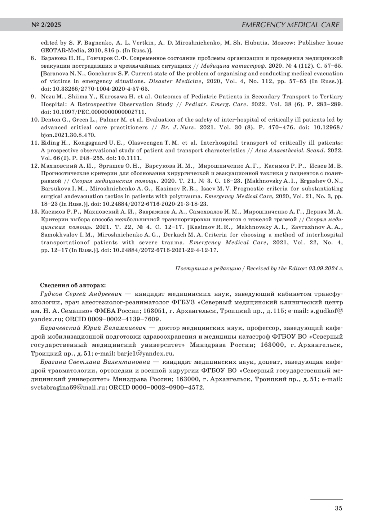 8. Баранова Н. Н., Гончаров С. Ф. Современное состояние проблемы организации и проведения медицинской эвакуации пострадавших в чрезвычайных ситуациях // Медицина катастроф. 2020. № 4 (112). С. 57-65.