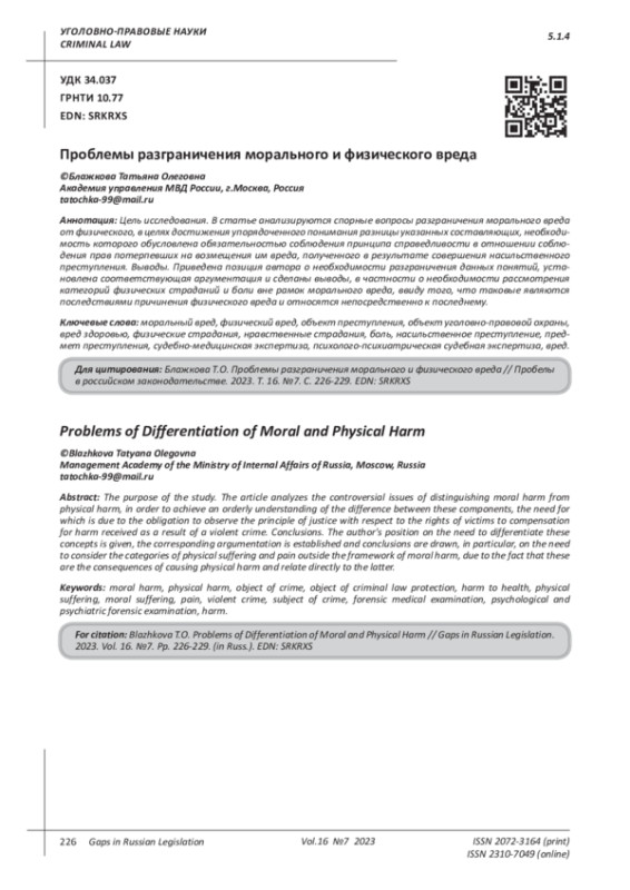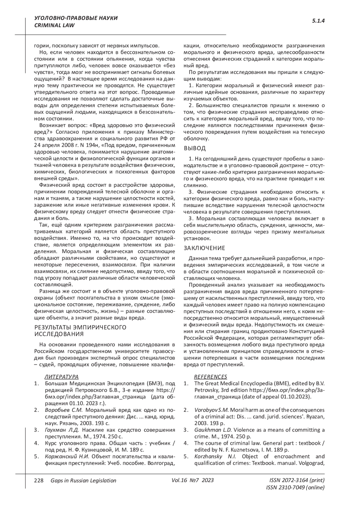 2. Воробьев С.М. Моральный вред как одно из последствий преступного деяния: Дис.... канд. юрид. наук. Рязань, 2003. 193 с. EDN: QWGRZD