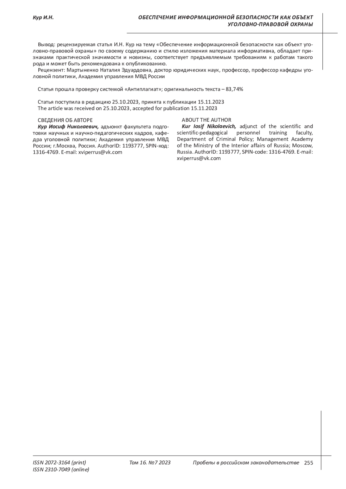 6. Козороиз Н.Л. Законодательство защищает информацию // Право в вооруженных силах. 2013. № 9.