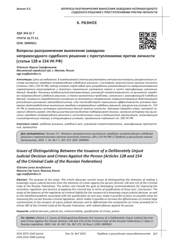 Цель исследования. В предлагаемой статье рассмотрены актуальные вопросы разграничения состава вынесения заведомо неправосудного судебного решения с составами преступлений против личности (статьи 128 и 154 УК РФ). Автор ставит перед собой цель разработки рекомендаций по совершенствованию нормативного регулирования и практики применения уголовного закона в части квалификации указанных деяний. Выводы. Изучение особенностей регламентации уголовной ответственности за вынесение заведомо неправосудного судебного решения, а также выявленные проблемы, связанные с квалификацией подобных деяний, позволили сосредоточить внимание на возможных направлениях совершенствования действующего российского уголовного законодательства, что поспособствует повышению эффективности уголовно-правового противодействия вынесению заведомо неправосудных судебных решений, разграничив состав ст. 154 УК РФ со смежными составами преступных деяний против личности. Автором проведен опрос, который позволил сделать вывод, что большинство респондентов поддерживает мнение, согласно которому при вынесении заведомо неправосудного решения о госпитализации лица в медицинскую организацию, оказывающую психиатрическую помощь в стационарных условиях, применению подлежит ст. 305 УК РФ.