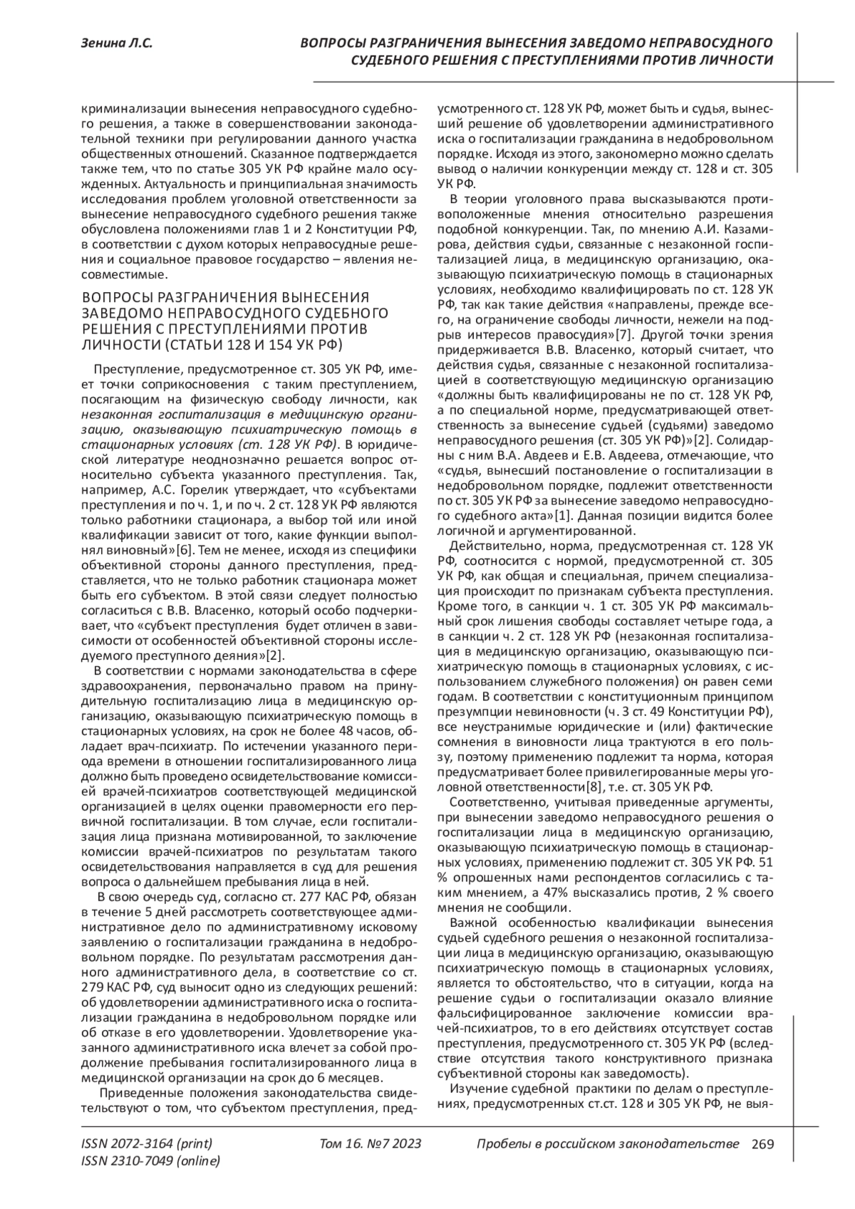 2. Власенко В.В. Некоторые проблемы уголовной ответственности за незаконную госпитализацию в медицинскую организацию, оказывающую психиатрическую помощь в стационарных условиях (ст. 128 УК РФ) // Медицинское право. 2016. № 3. С. 38-43. EDN: WAHQMR