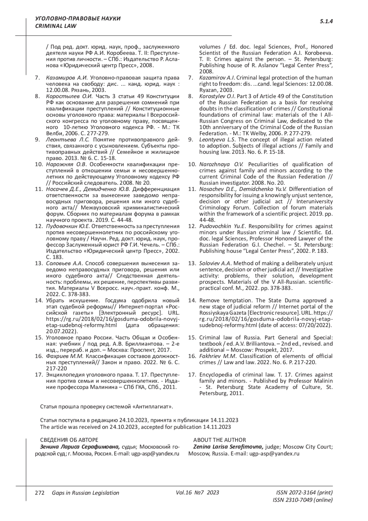 13. Соловьев А.А. Способ совершения вынесения заведомо неправосудных приговора, решения или иного судебного акта// Следственная деятельность: проблемы, их решение, перспективы развития. Материалы V Всеросс. науч.-практ. конф. М., 2022. С. 378-383. EDN: WREFVI