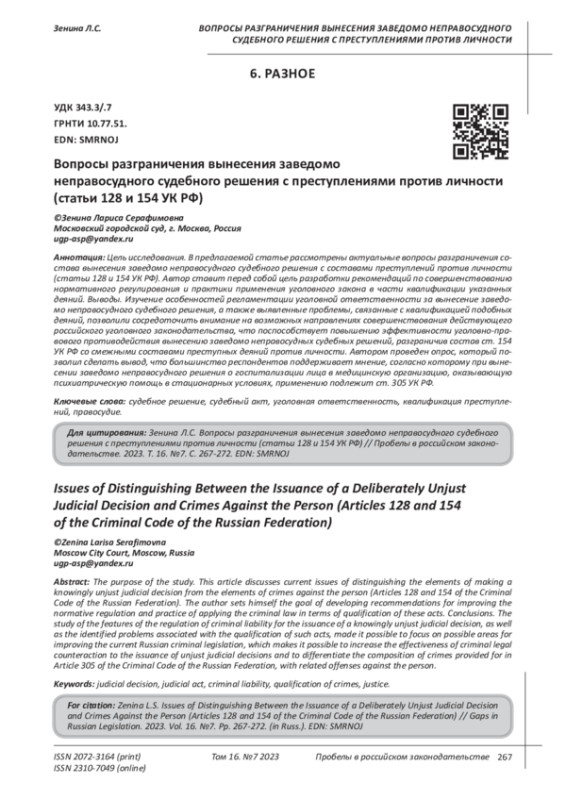 Nosachev D.E., Demidchenko Yu.V. Differentiation of responsibility for issuing a knowingly unjust sentence, decision or other judicial act // Interuniversity Criminology Forum. Collection of forum materials within the framework of a scientific project. 2019. pp. 44-48.