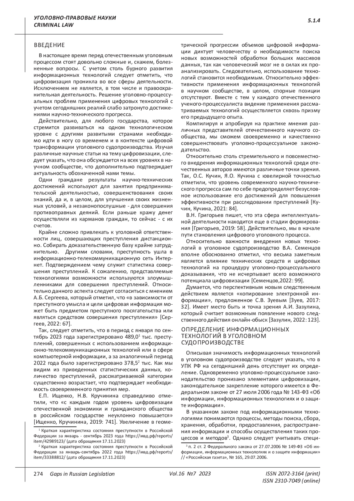 5. Семенцов В.А. Цифровые технологии в отечественном уголовном судопроизводстве // Юридический вестник Кубанского государственного университета. - 2022. - № 4. - С. 97-105. EDN: SIQYEN
