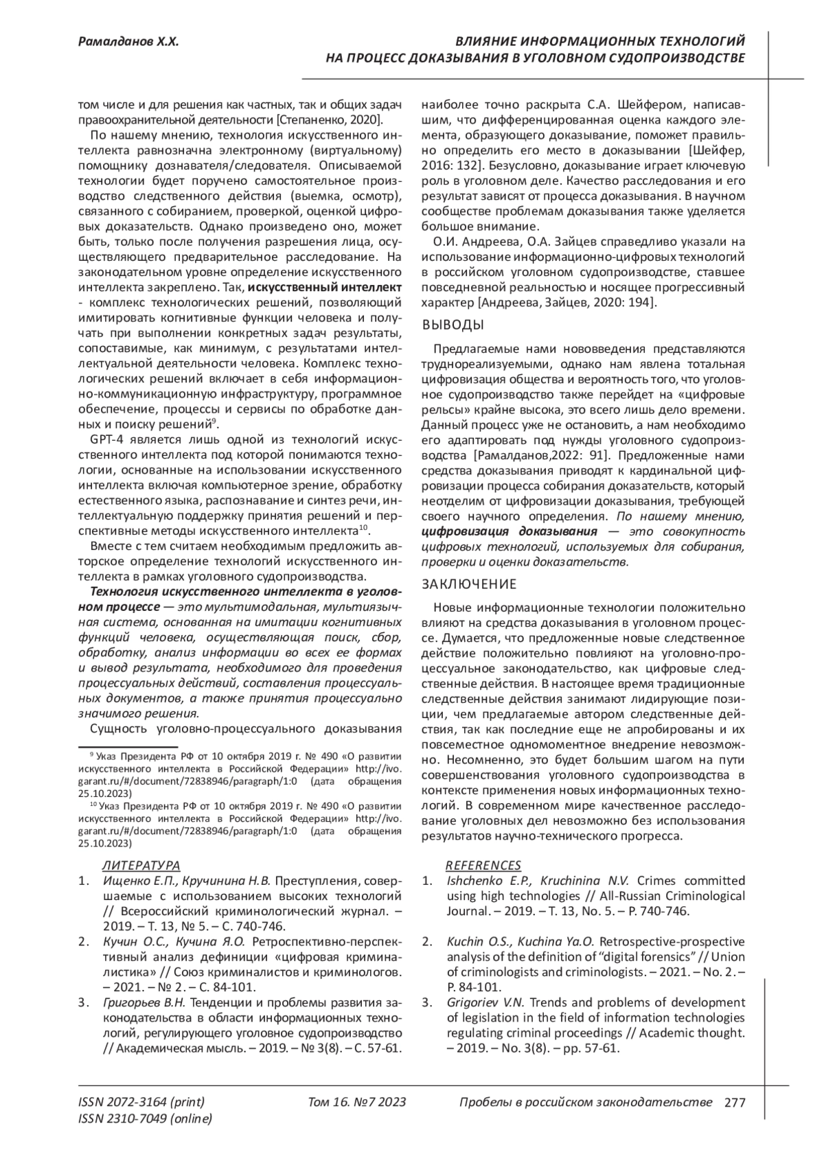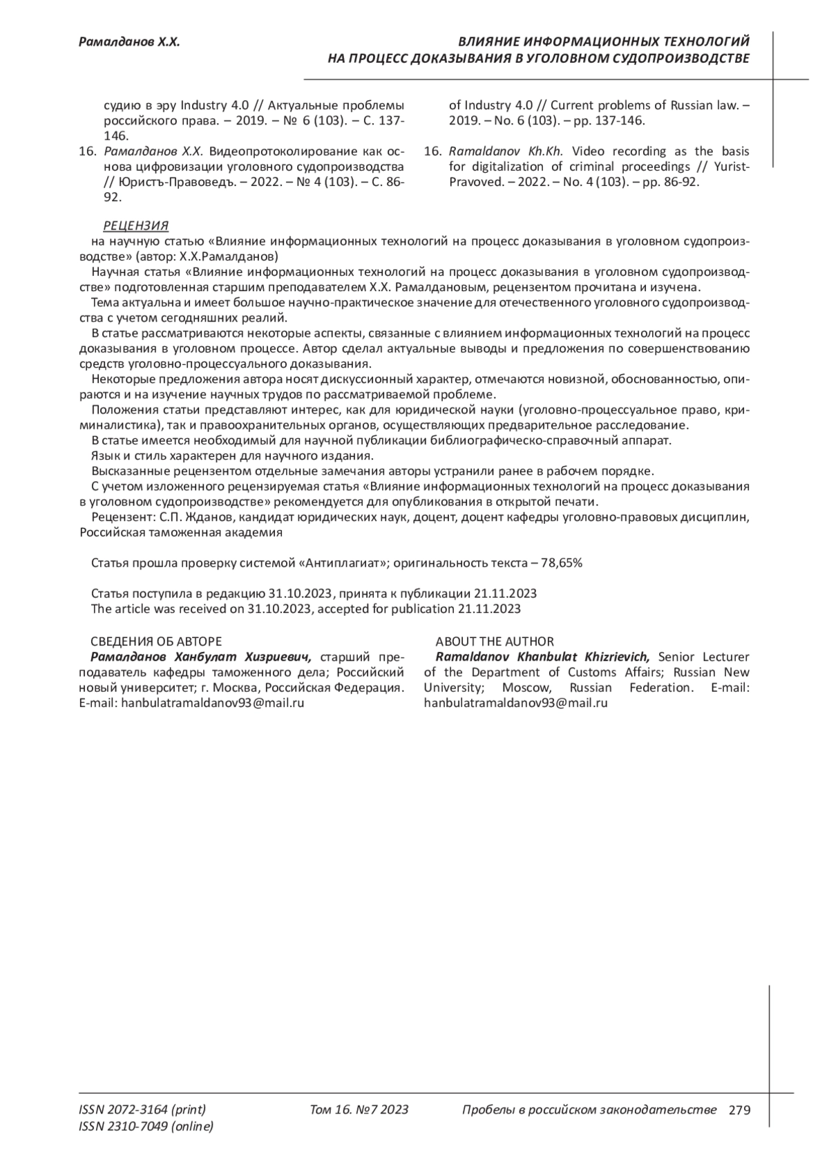16. Рамалданов Х.Х. Видеопротоколирование как основа цифровизации уголовного судопроизводства // Юристъ-Правоведъ. - 2022. - № 4 (103). - С. 86-92. EDN: WNEIOM