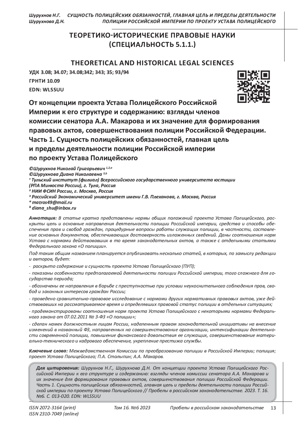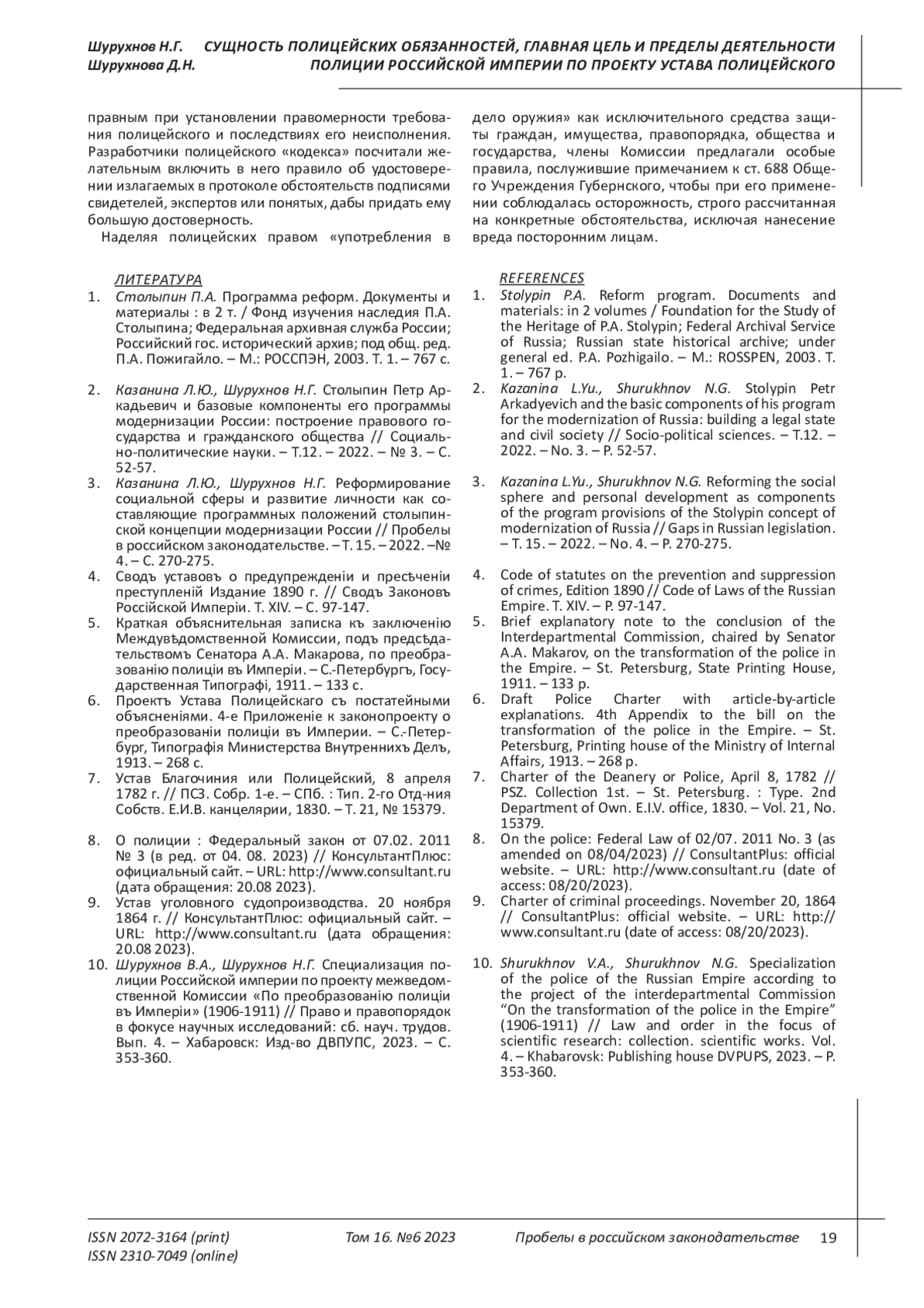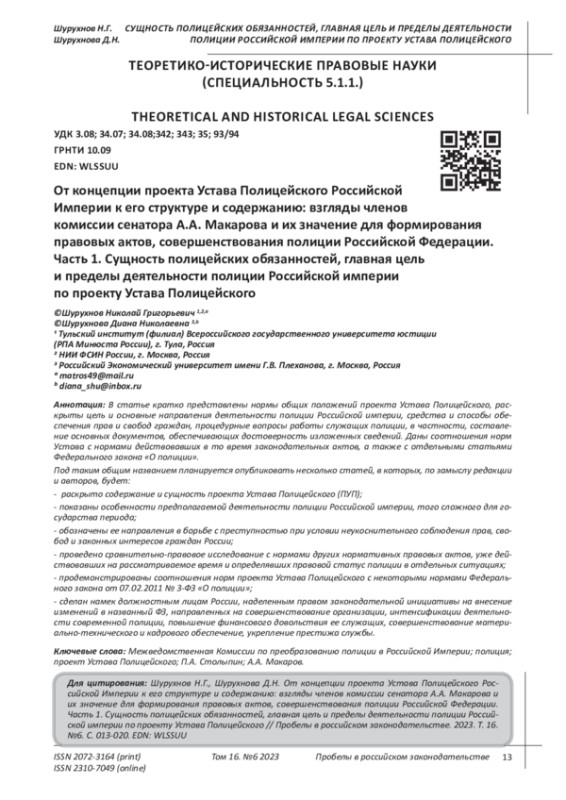 10. 	Шурухнов В.А., Шурухнов Н.Г. Специализация полиции Российской империи по проекту межведомственной Комиссии “По преобразованiю полицiи въ Имперiи” (1906-1911) // Право и правопорядок в фокусе научных исследований: сб. науч. трудов. Вып. 4. - Хабаровск: Изд-во ДВПУПС, 2023. - С. 353-360. EDN: JNUJYA