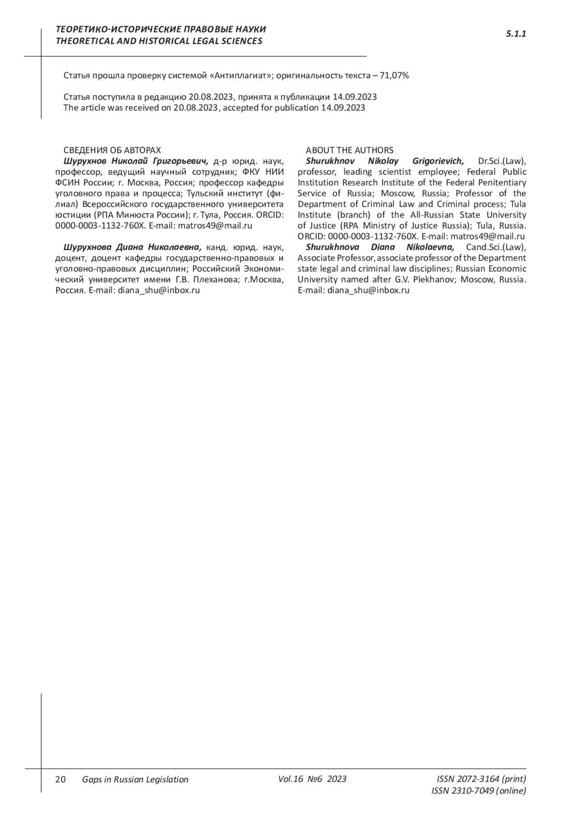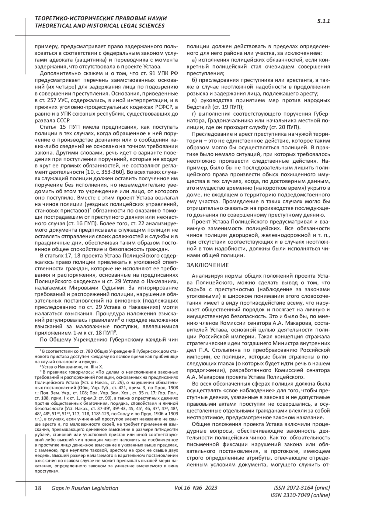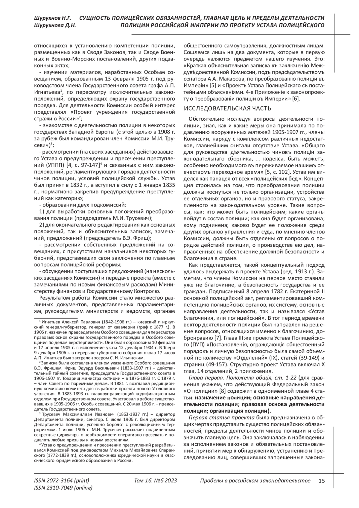 10. 	Шурухнов В.А., Шурухнов Н.Г. Специализация полиции Российской империи по проекту межведомственной Комиссии “По преобразованiю полицiи въ Имперiи” (1906-1911) // Право и правопорядок в фокусе научных исследований: сб. науч. трудов. Вып. 4. - Хабаровск: Изд-во ДВПУПС, 2023. - С. 353-360. EDN: JNUJYA