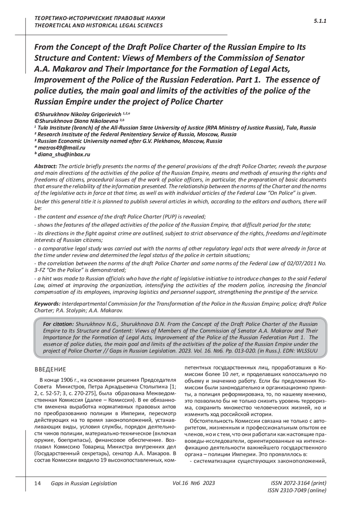 Shurukhnov V.A., Shurukhnov N.G. Specialization of the police of the Russian Empire according to the project of the interdepartmental Commission “On the transformation of the police in the Empire” (1906-1911) // Law and order in the focus of scientific research: collection. scientific works. Vol. 4. - Khabarovsk: Publishing house DVPUPS, 2023. - P. 353-360.