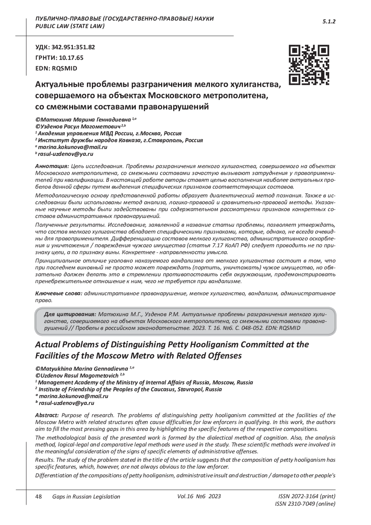 Smolyakov, A. I. Problematic issues of qualification of petty hooliganism / A. I. Smolyakov // Scientific Bulletin of the Oryol Law Institute of the Ministry of Internal Affairs of Russia named after V.V. Lukyanov. - 2018. - No. 1 (74). - P. 80-83.