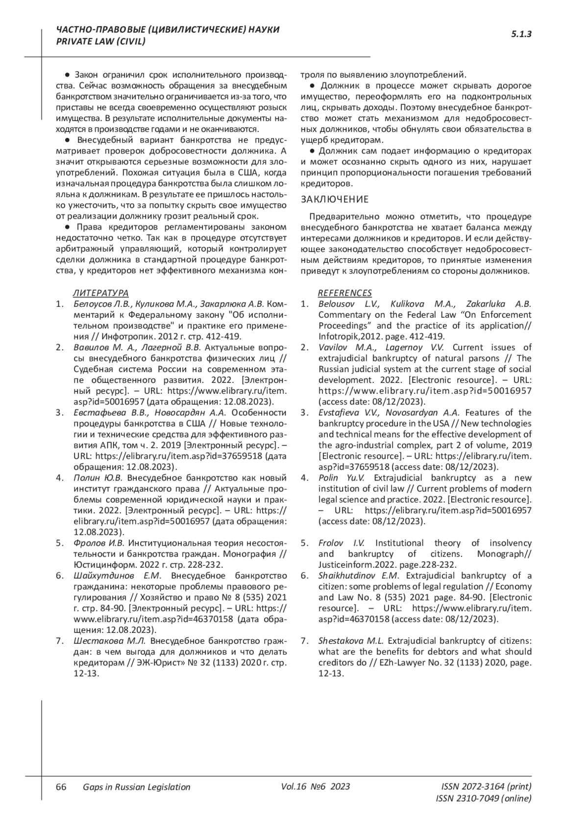 6. Шайхутдинов Е.М. Внесудебное банкротство гражданина: некоторые проблемы правового регулирования // Хозяйство и право № 8 (535) 2021 г. стр. 84-90. [Электронный ресурс]. - URL: item.asp?id=46370158 (дата обращения: 12.08.2023). EDN: MFIBXF