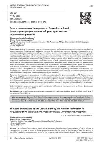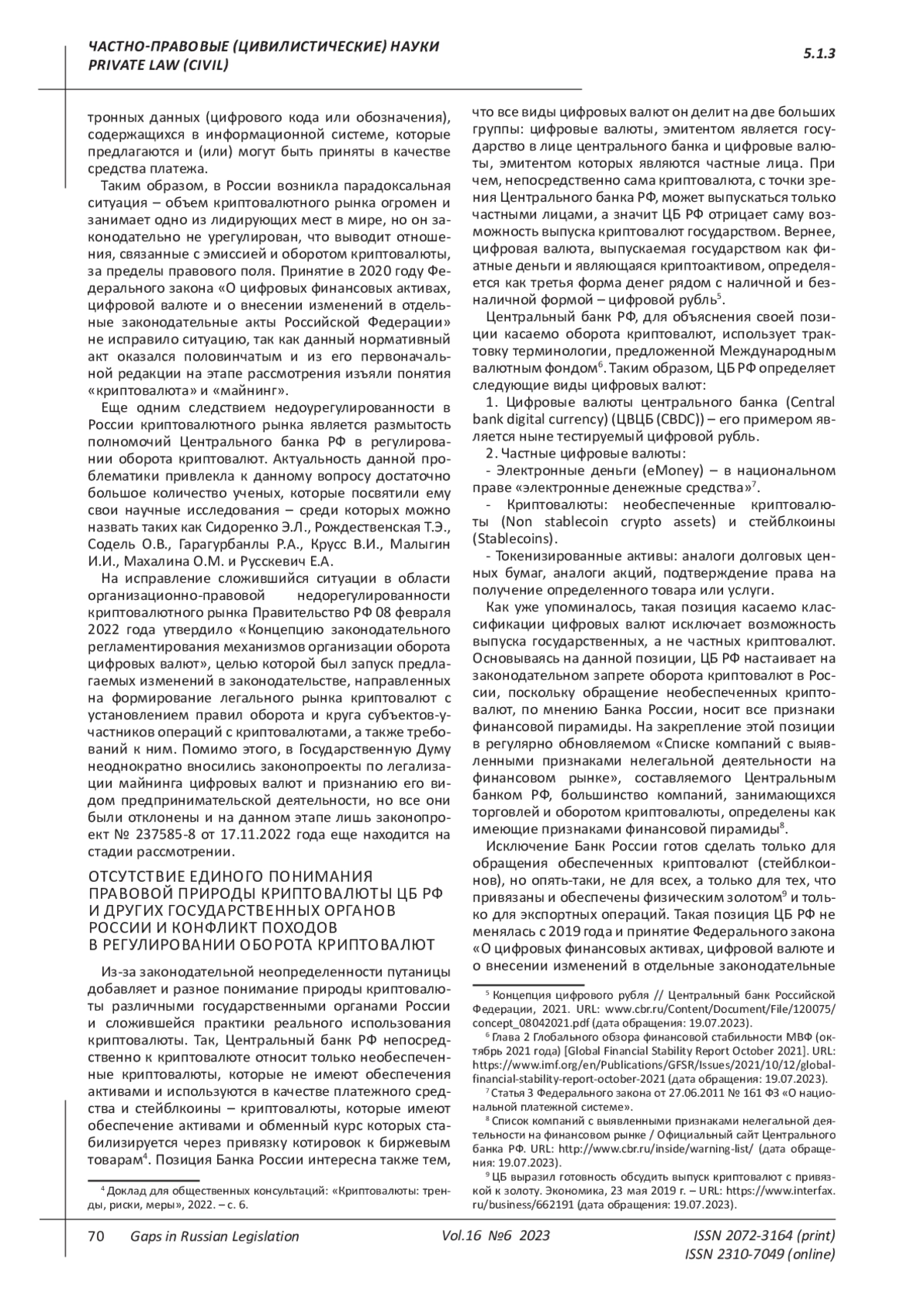 11. О.В. Содель. Полномочия Банка России в области обращения цифровых финансовых активов и криптовалюты // Вестник Саратовской государственной юридической академии. № 4 (147). 2022, с. 208 - 213. DOI: 10.24412/2227-7315-2022-4-208-213