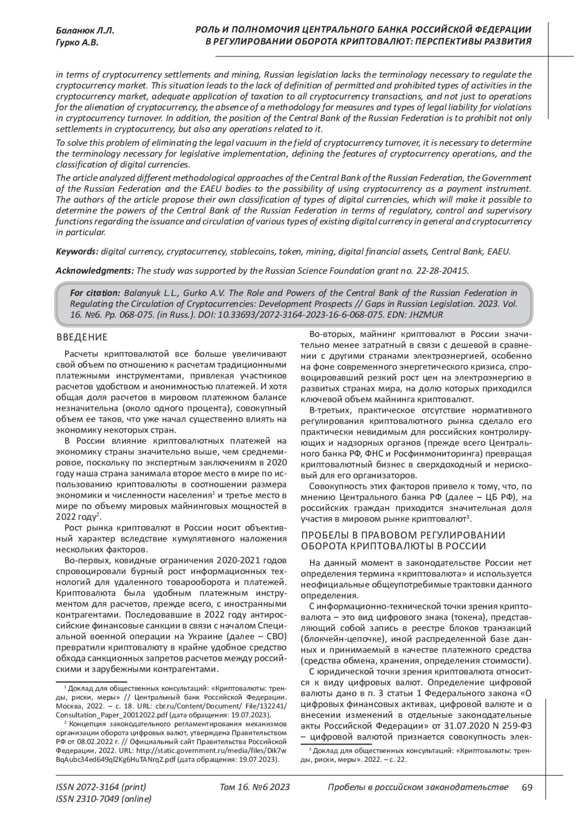 Цель исследования. В статье рассматриваются особенности правового регулирования оборота криптовалюты в России как вида цифровой валюты для определения степени дефицита правового инструментария в сфере регулирования, надзора и контроля криптовалютного рынка. Выводы. Несмотря на лидирующие позиции России по объему криптовалютными расчетами и майнингу, в российском законодательстве отсутствует необходимая для регулирования криптовалютного рынка терминология. Такая ситуация приводит к отсутствию определения разрешенных и запрещенных видов деятельности на криптовалютном рынке, адекватного применения налогообложения ко всем криптовалютным операциям, а не только к операциям по отчуждению криптовалюты, отсутствии методики мер и видов юридической ответственности за нарушения в криптовалютном обороте. Кроме этого, позиция Центрального банка РФ состоит в том, чтобы запретить не только расчеты в криптовалюте, но и любые, связанные с ней операции. Для решения данной проблемы по ликвидации правового вакуума в сфере криптовалютного оборота нужно определить необходимую для законодательного внедрения терминологию, определяющую особенности криптовалютных операций, и классификацию цифровых валют. В статье был проведен анализ разных методологических подходов Центрального банка РФ, Правительства РФ и органов ЕАЭС к возможности применения криптовалюты как платежного инструмента. Авторы статьи предлагают собственную классификацию видов цифровых валют, которая даст возможность определить полномочия Центрального банка РФ по регуляторным и контрольно-надзорным функциям касаемо выпуска и обращения разных видов существующей цифровой валюты в общем и криптовалюты, в частности.