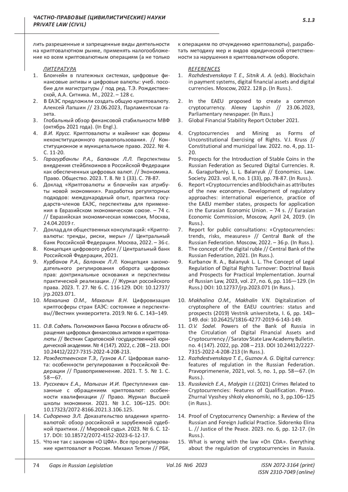 9. Курбанов Р.А., Баланюк Л.Л. Концепция законодательного регулирования оборота цифровых прав: доктринальные основания и перспективы практической реализации. // Журнал российского права. 2023. Т. 27. № 6. С. 116-129. DOI: 10.12737/jrp.2023.071 EDN: UVHHCP
