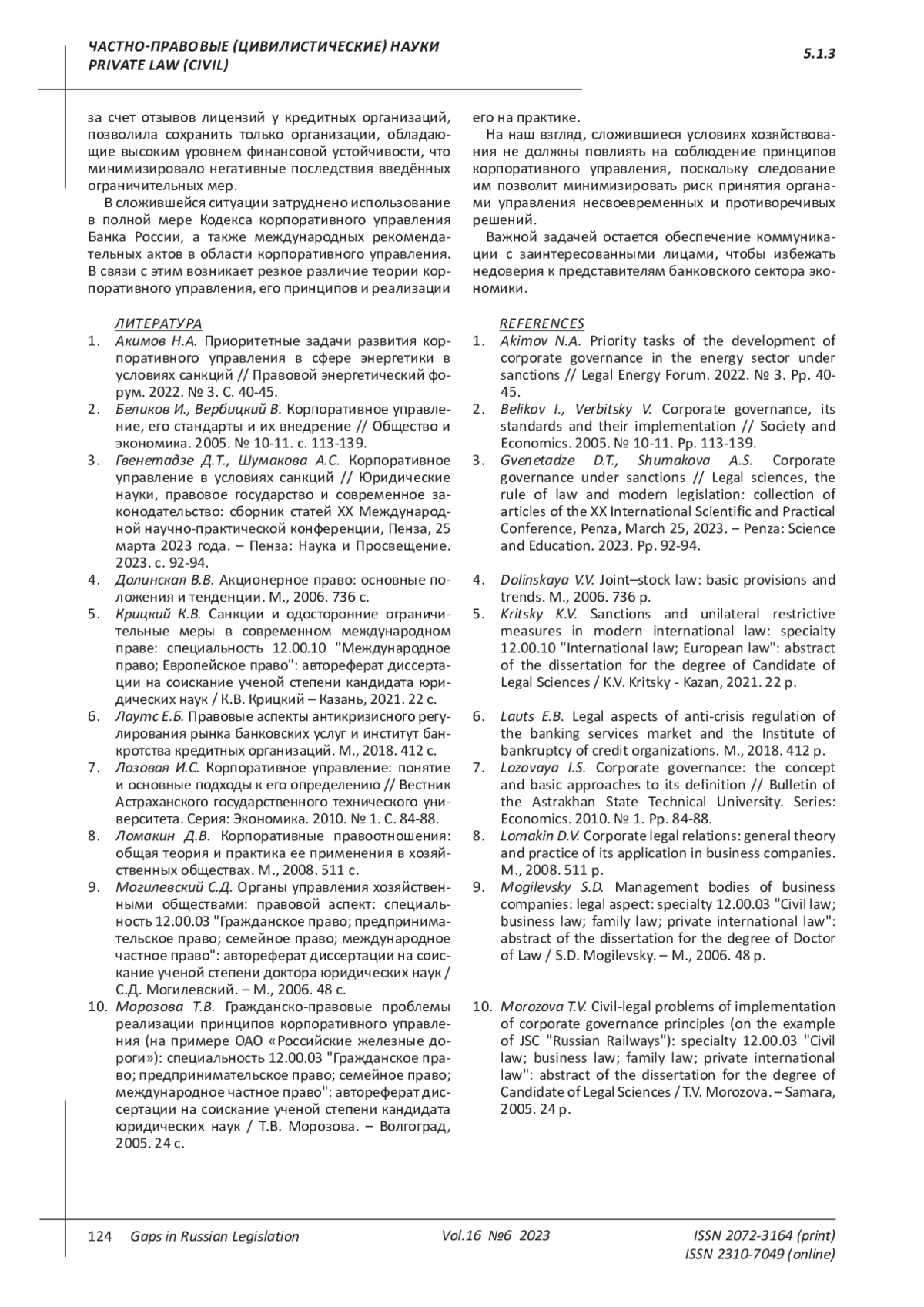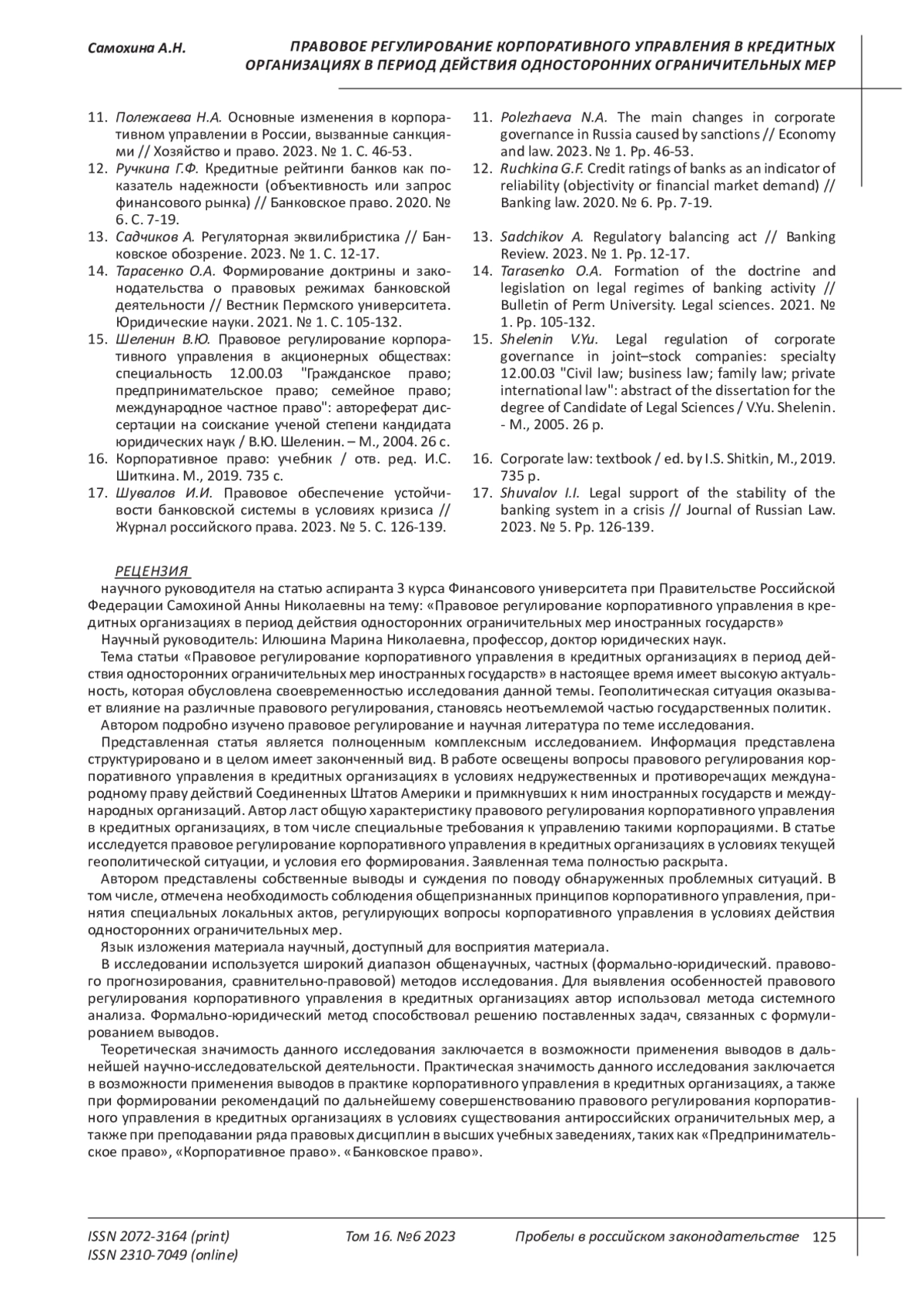 11. Полежаева Н.А. Основные изменения в корпоративном управлении в России, вызванные санкциями // Хозяйство и право. 2023. № 1. С. 46-53. EDN: SESGLT