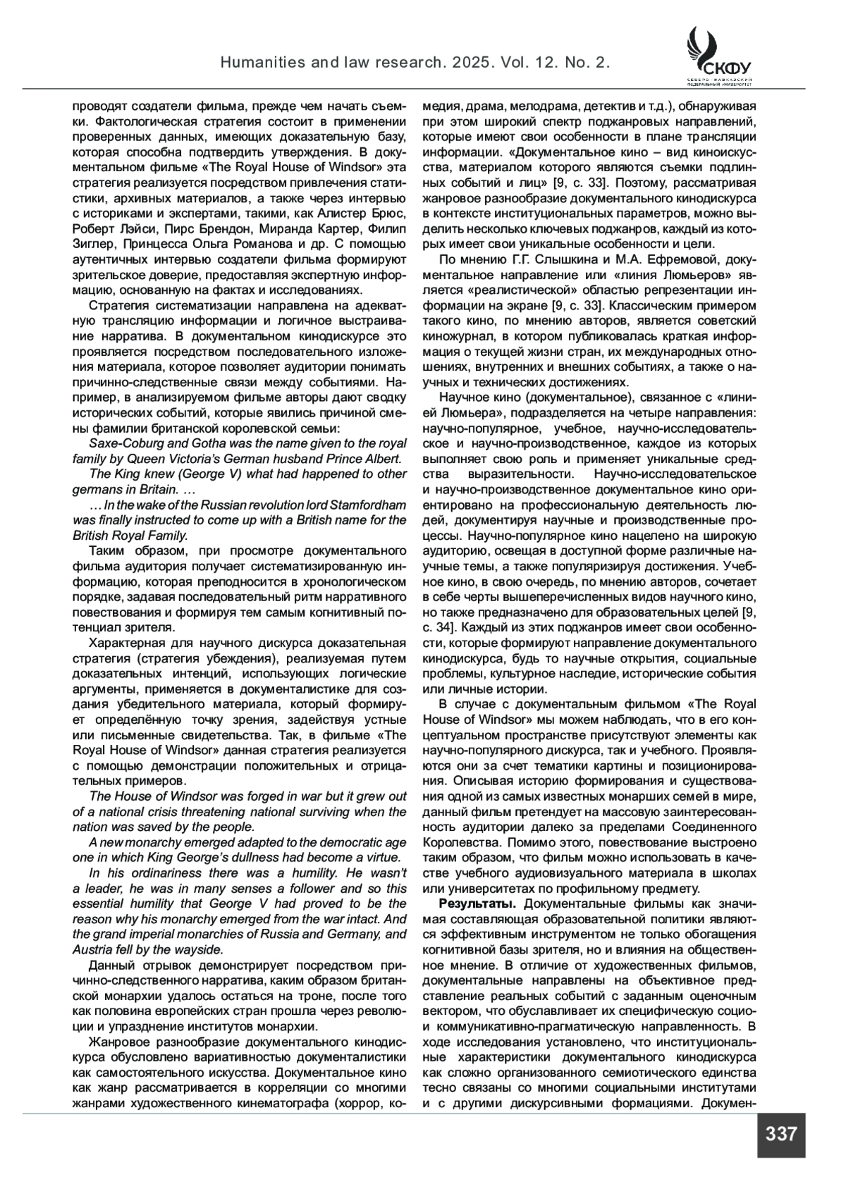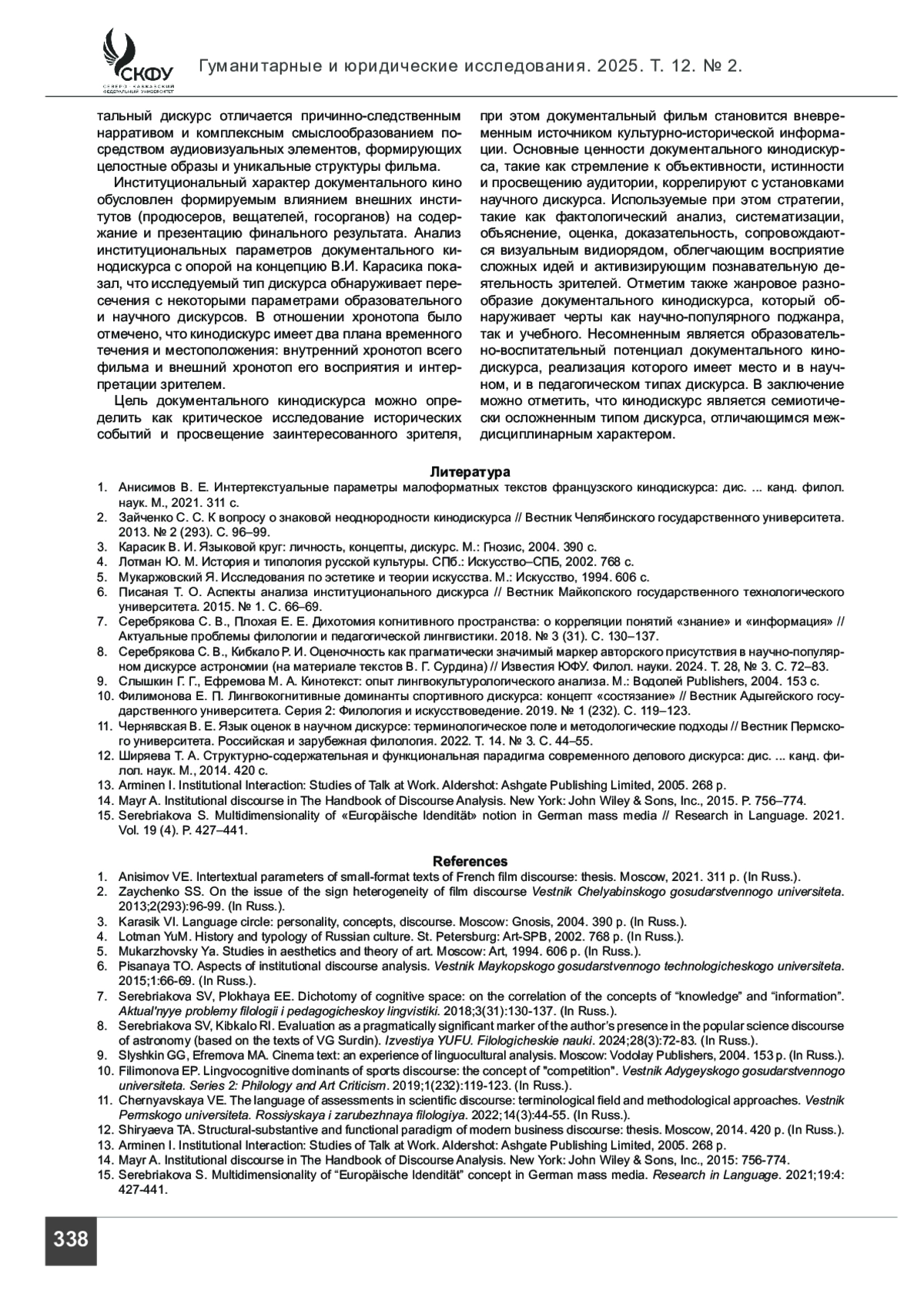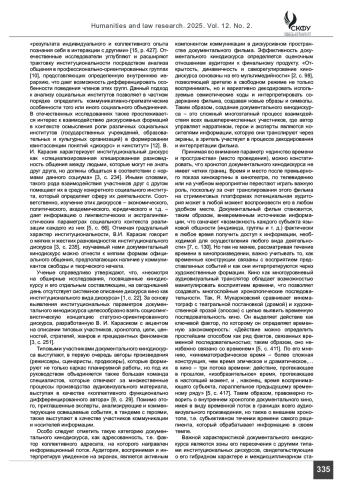 Введение. Данная работа представляет собой комплексное исследование документального кинодискурса как институциональной формы коммуникации. Документальные фильмы играют важную роль в политической и образовательной сферах, выступая в качестве инструмента воздействия и пропаганды благодаря оценочному вектору представления знаковых для общества реальных событий, что обусловливает их особый социокультурный и прагматический потенциал.