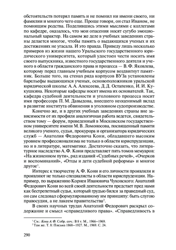 В статье автор анализирует вклад А. Ф. Кони в практику и теоретическое осмысление Судебной реформы 1864 г. В статье затрагиваются причины изменений законодательства, касающихся судоустройства и процесса, последовавших после утверждения документов Судебной реформой 1864 г. Предлагается различать изменения, которые кардинально меняли принципы, заложенные в реформу, и те, которые частично приспосабливали ее к обстоятельствам времени, в частности к повышению революционной активности. Изменения в правовом регулировании расследования и рассмотрения государственных преступлений приводят к разделению взглядов на борьбу с политической преступностью среди российских чиновников. Либеральные круги, в том числе и А. Ф. Кони, выступают за большее внимание к воспитательной работе среди молодежи, консервативно настроенная часть общества настаивает на усилении репрессивного начала. В 1870-е гг. половинчатая политика правительства, вызванная беспрецедентным ростом терроризма в стране, не смогла установить единства взглядов на способы борьбы с антиправительственными выступлениями в среде правоохранителей. Дело В. Засулич рассматривается как пример такой половинчатости в борьбе власти с государственной преступностью, когда в целях «смягчения» напряженности была сделана попытка представить типичное государственное преступление как попытку убийства на почве мести.