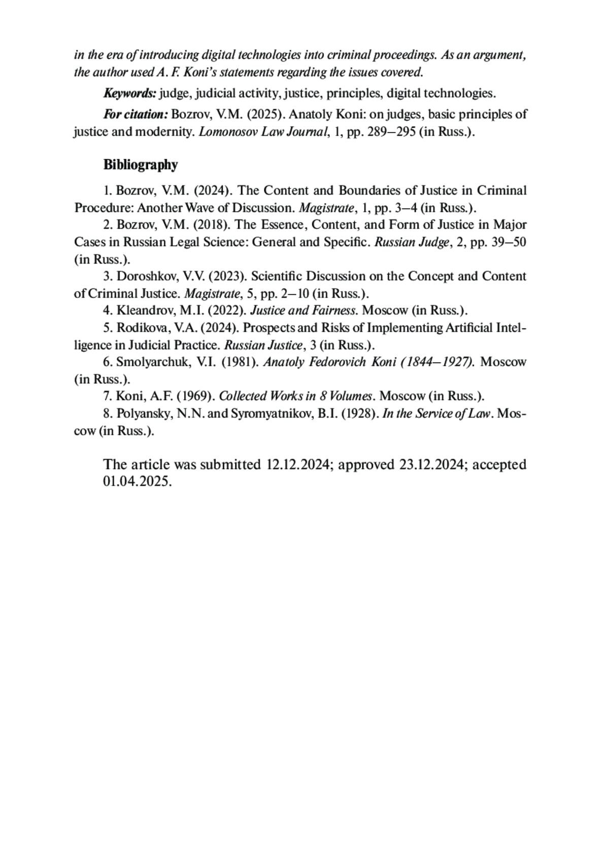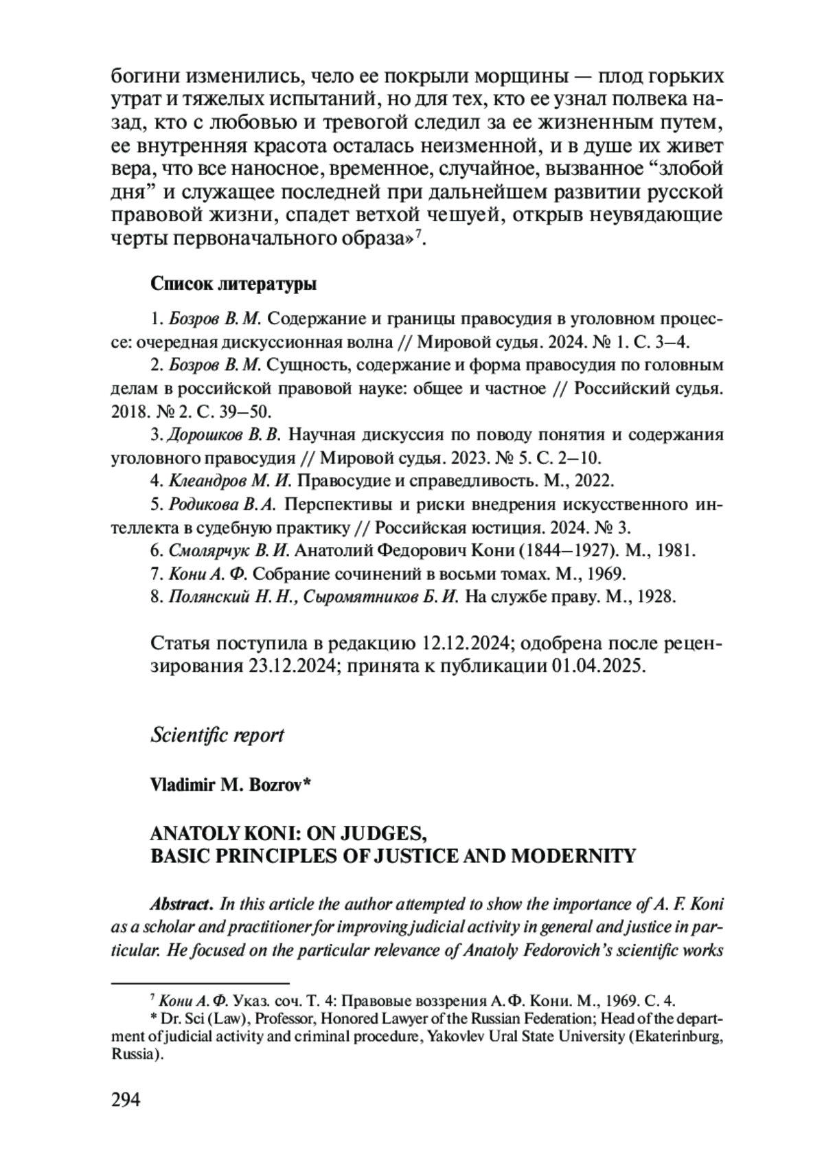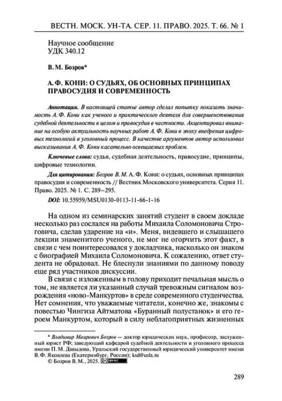 1. Бозров В. М. Содержание и границы правосудия в уголовном процессе: очередная дискуссионная волна // Мировой судья. 2024. № 1. С. 3-4. EDN: CYLJFK