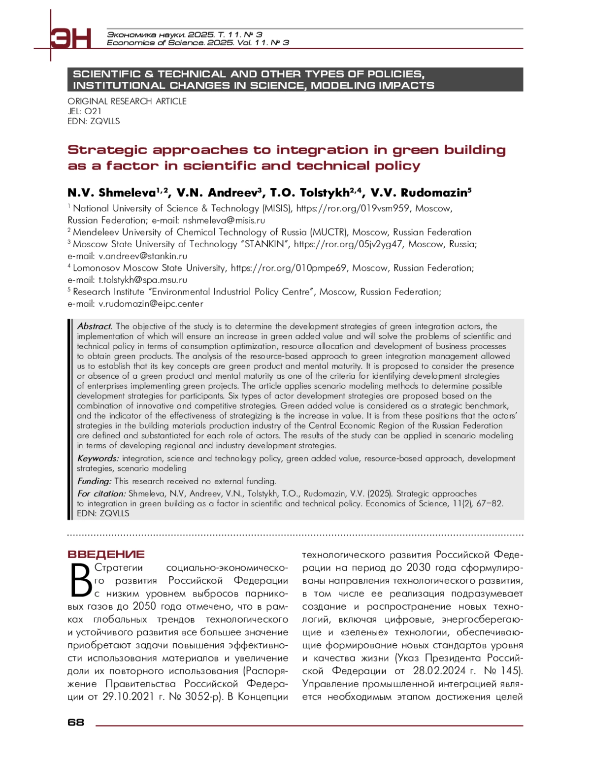 Цель исследования – определить стратегии развития акторов «зеленой» интеграции, реализация которых обеспечивает приращение добавленной ценности и способствует решению задач научно-технической политики по оптимизации потребления, распределению ресурсов и разработке бизнес-процессов для производства «зеленых» продуктов. Анализ ресурсного подхода к управлению интеграцией позволил установить, что его ключевыми концепциями являются «зеленый» продукт и ментальная зрелость. Реализацию этих концепций предлагается рассматривать в качестве одного из критериев для идентификации стратегий развития предприятий, реализующих эко-проекты. В статье применены методы сценарного моделирования для определения возможных стратегий развития участников интеграционных процессов. Предложены шесть типов стратегий развития акторов на основе объединения инновационных и конкурентных стратегий. «Зеленая» добавленная ценность рассматривается как стратегический ориентир, а показателем эффективности стратегирования служит приращение ценности. С этих позиций для каждой роли акторов обоснованы стратегии акторов в отрасли производства строительных материалов Центрального экономического района России. Результаты исследования могут быть применимы при сценарном моделировании для разработки региональных и отраслевых стратегий развития.