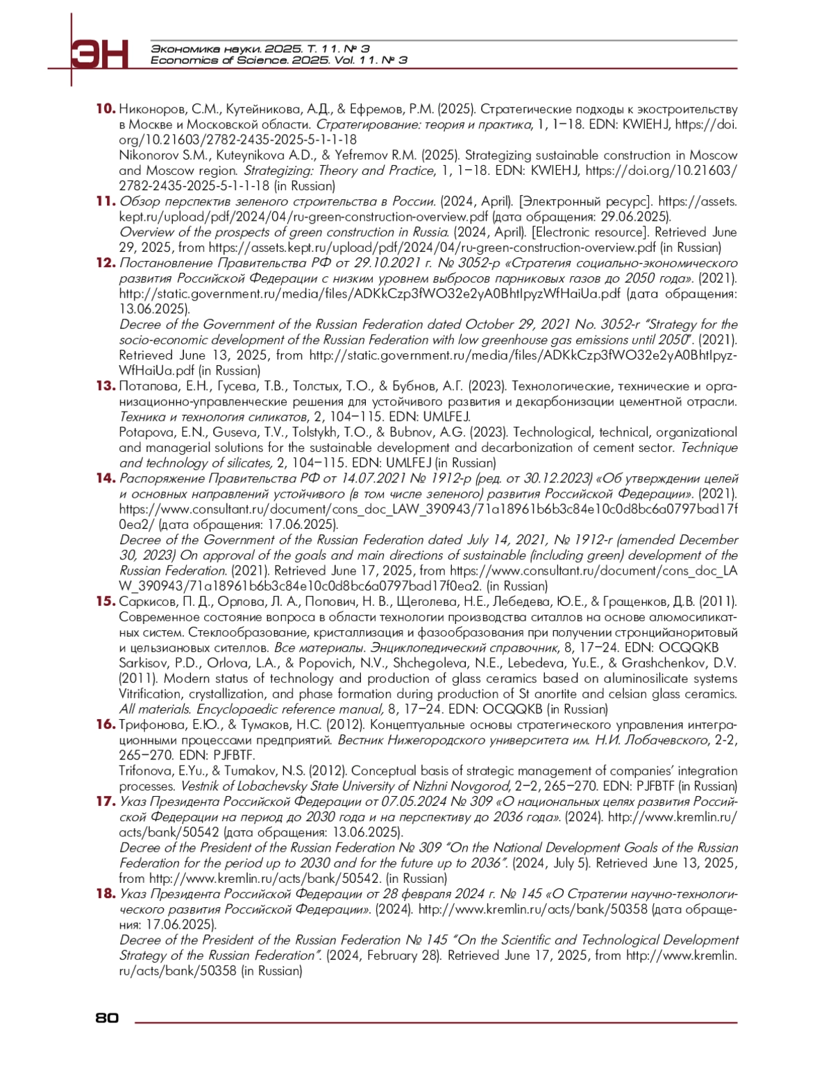 10. Никоноров, С.М., Кутейникова, А.Д., & Ефремов, Р.М. (2025). Стратегические подходы к экостроительству в Москве и Московской области. Стратегирование: теория и практика, 1, 1-18. EDN: KWIEHJ, https://doi.org/10.21603/2782-2435-2025-5-1-1-18