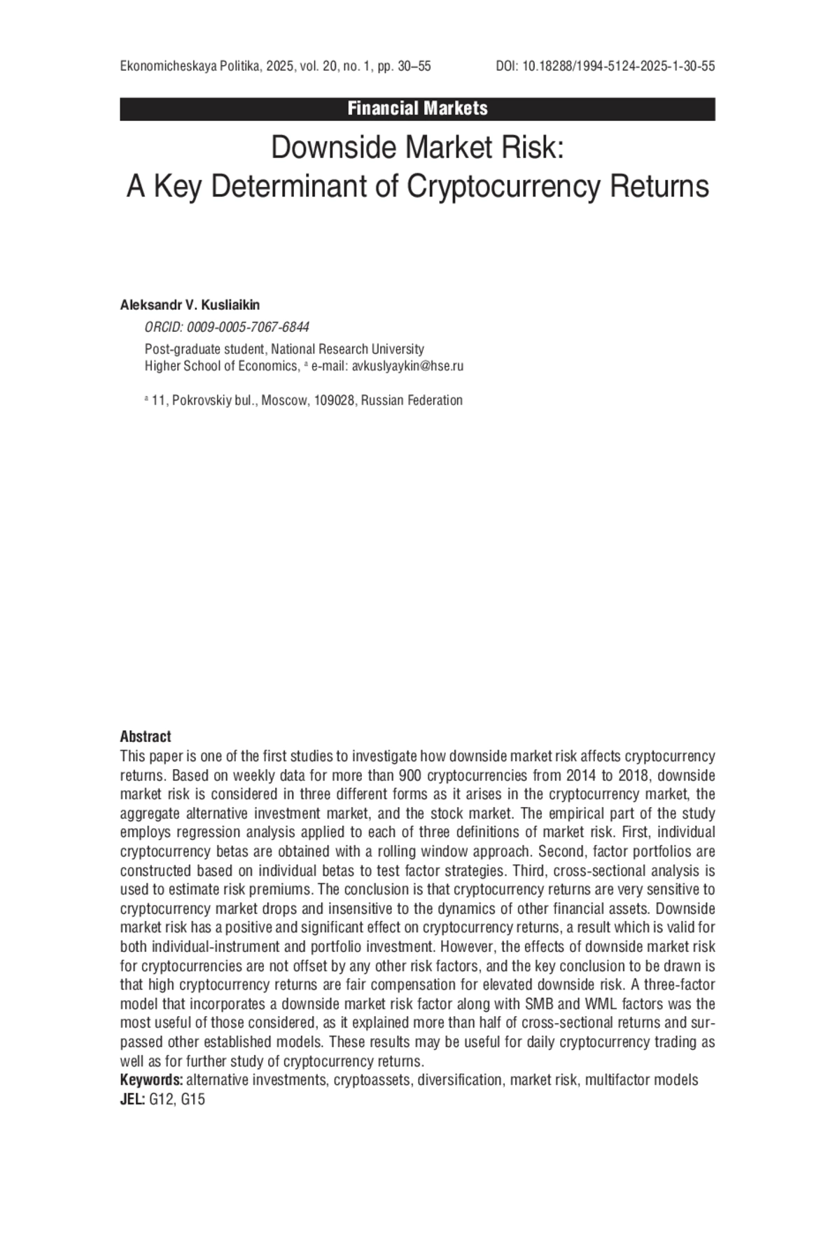 Какую роль в формировании доходности криптовалют играет фактор риска синхронного падения — обесценения отдельных криптовалют и портфелей при падении рынка в целом? Ответу на этот вопрос посвящена настоящая работа. Исследование строится на недельных данных за 2014–2018 годы и охватывает свыше 900 криптовалют. Эмпирическая часть содержит регрессионный анализ, рассматривающий сразу три подхода к измерению систематического риска криптовалют, соответствующих различным положениям криптоактивов в портфелях инвесторов. В рамках этого оцениваются индивидуальные коэффициенты чувствительности криптовалют к рискам, строятся факторные портфели и тестируются портфельные стратегии, проводится кросс-секционный анализ с определением значимых риск-премий — всего более 315 тысяч регрессионных итераций. В результате выявлено, что криптоактивы очень чувствительны к риску обвала на рынке криптовалют, но нечувствительны к происходящему на рынке акций, а также на рынках, относящихся к альтернативным инвестициям, сохраняя свою автономность. Более подверженные риску синхронного падения инструменты в среднем являются более доходными, причем данная закономерность обнаруживается как на уровне отдельных инструментов, так и на уровне крупных портфелей криптовалют и не может быть отнесена к ненаблюдаемым факторам. Усредненная премия за риск синхронного падения составила 1,3% в неделю и оказалась ключевым компонентом доходностей криптовалют. Таким образом, высокие доходности криптоактивов являются лишь компенсацией за соответствующие высокие риски синхронного падения. Одновременно в исследовании подтверждается значимость факторов SMB и WML, отражающих надбавки за риски малой капитализации и высоких прошлых доходностей соответственно, для доходностей криптоактивов и предлагается трехфакторная модель, успешно объясняющая более 50% кросс-секционных доходностей криптовалют, превосходя уже представленные в литературе модели. Полученные результаты могут применяться в рамках дальнейших теоретических исследований, посвященных доходностям криптовалют, и в ходе управления инвестициями в криптовалюты портфельными менеджерами и индивидуальными инвесторами.