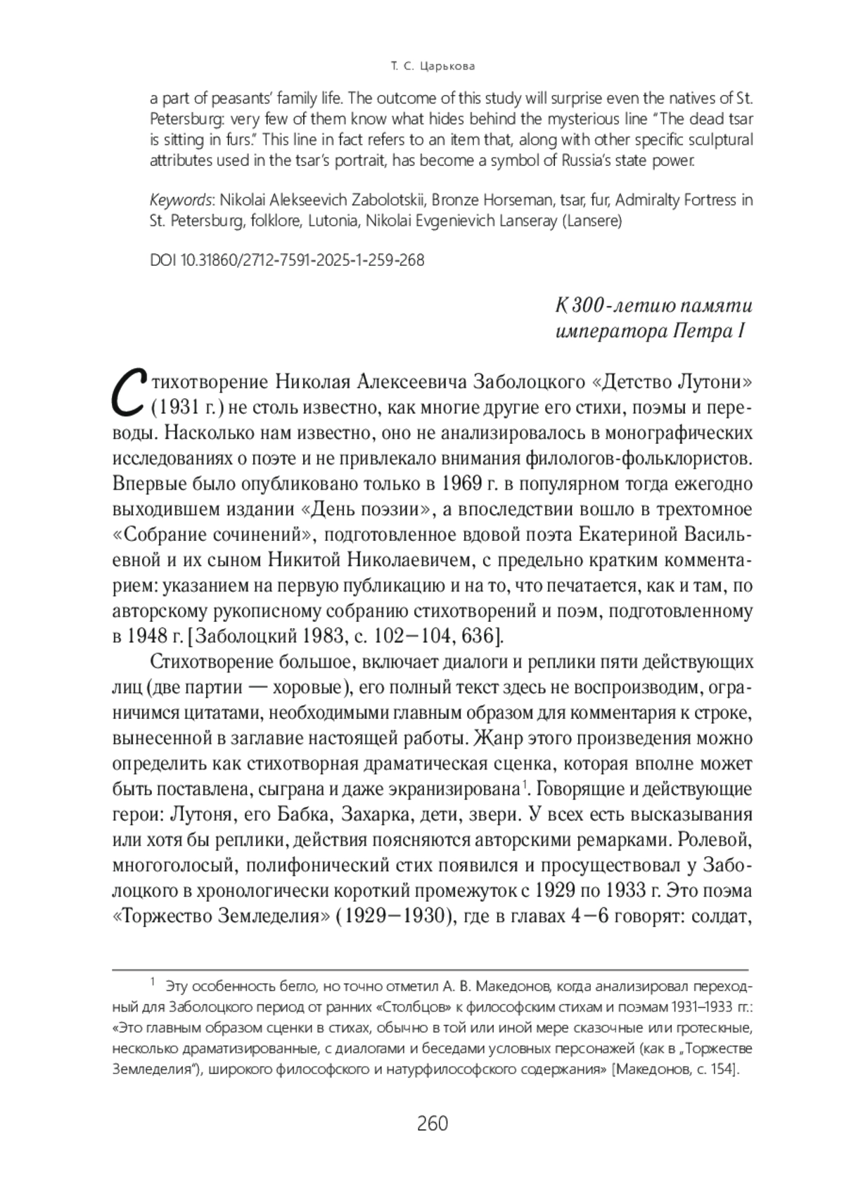Предмет исследования — стихотворение Н. А. Заболоцкого «Детство Лутони» в аспекте его геопоэтики. В литературоведческих работах о поэте это стихотворение не упоминается. А оно интересно еще и тем, что это единственное произведение Заболоцкого, выполненное в соотнесении с традиционными образами и жанрами русского фольклора: детскими играми и сказками, действительно бытовавшими в крестьянских семьях. Итог краеведческих разысканий автора будет неожиданым даже для жителей Петербурга: мало кто из них знает, как разгадать загадочную строку поэта: «Мертвый царь сидит в меху» — о предмете, который стал наряду с другими скульптурными атрибутами в изображении самодержца символом утверждения русской государственной власти.