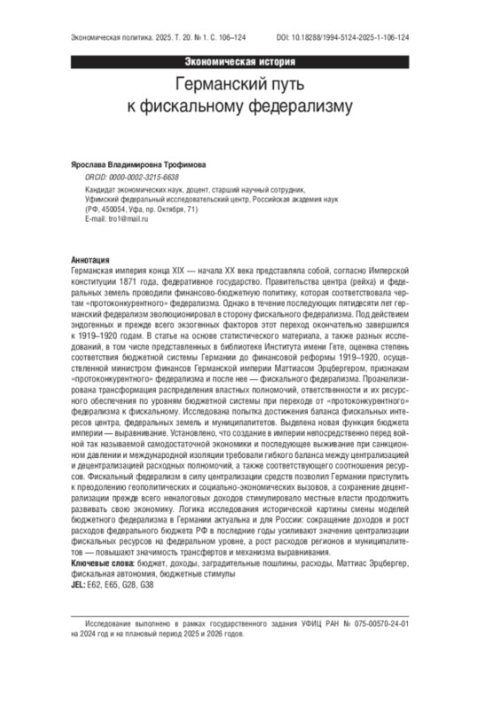 Германская империя конца XIX — начала XX века представляла собой, согласно Имперской конституции 1871 года, федеративное государство. Правительства центра (рейха) и федеральных земель проводили финансово-бюджетную политику, которая соответствовала чертам «протоконкурентного» федерализма. Однако в течение последующих пятидесяти лет германский федерализм эволюционировал в сторону фискального федерализма. Под действием эндогенных и прежде всего экзогенных факторов этот переход окончательно завершился к 1919–1920 годам. В статье на основе статистического материала, а также разных исследований, в том числе представленных в библиотеке Института имени Гете, оценена степень соответствия бюджетной системы Германии до финансовой реформы 1919–1920, осуществленной министром финансов Германской империи Маттиасом Эрцбергером, признакам «протоконкурентного» федерализма и после нее — фискального федерализма. Проанализирована трансформация распределения властных полномочий, ответственности и их ресурсного обеспечения по уровням бюджетной системы при переходе от «протоконкурентного» федерализма к фискальному. Исследована попытка достижения баланса фискальных интересов центра, федеральных земель и муниципалитетов. Выделена новая функция бюджета империи — выравнивание. Установлено, что создание в империи непосредственно перед войной так называемой самодостаточной экономики и последующее выживание при санкционном давлении и международной изоляции требовали гибкого баланса между централизацией и децентрализацией расходных полномочий, а также соответствующего соотношения ресурсов. Фискальный федерализм в силу централизации средств позволил Германии приступить к преодолению геополитических и социально-экономических вызовов, а сохранение децентрализации прежде всего неналоговых доходов стимулировало местные власти продолжить развивать свою экономику. Логика исследования исторической картины смены моделей бюджетного федерализма в Германии актуальна и для России: сокращение доходов и рост расходов федерального бюджета РФ в последние годы усиливают значение централизации фискальных ресурсов на федеральном уровне, а рост расходов регионов и муниципалитетов — повышают значимость трансфертов и механизма выравнивания.