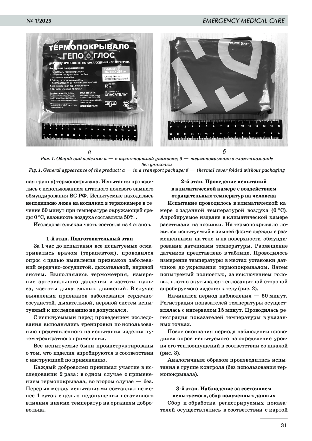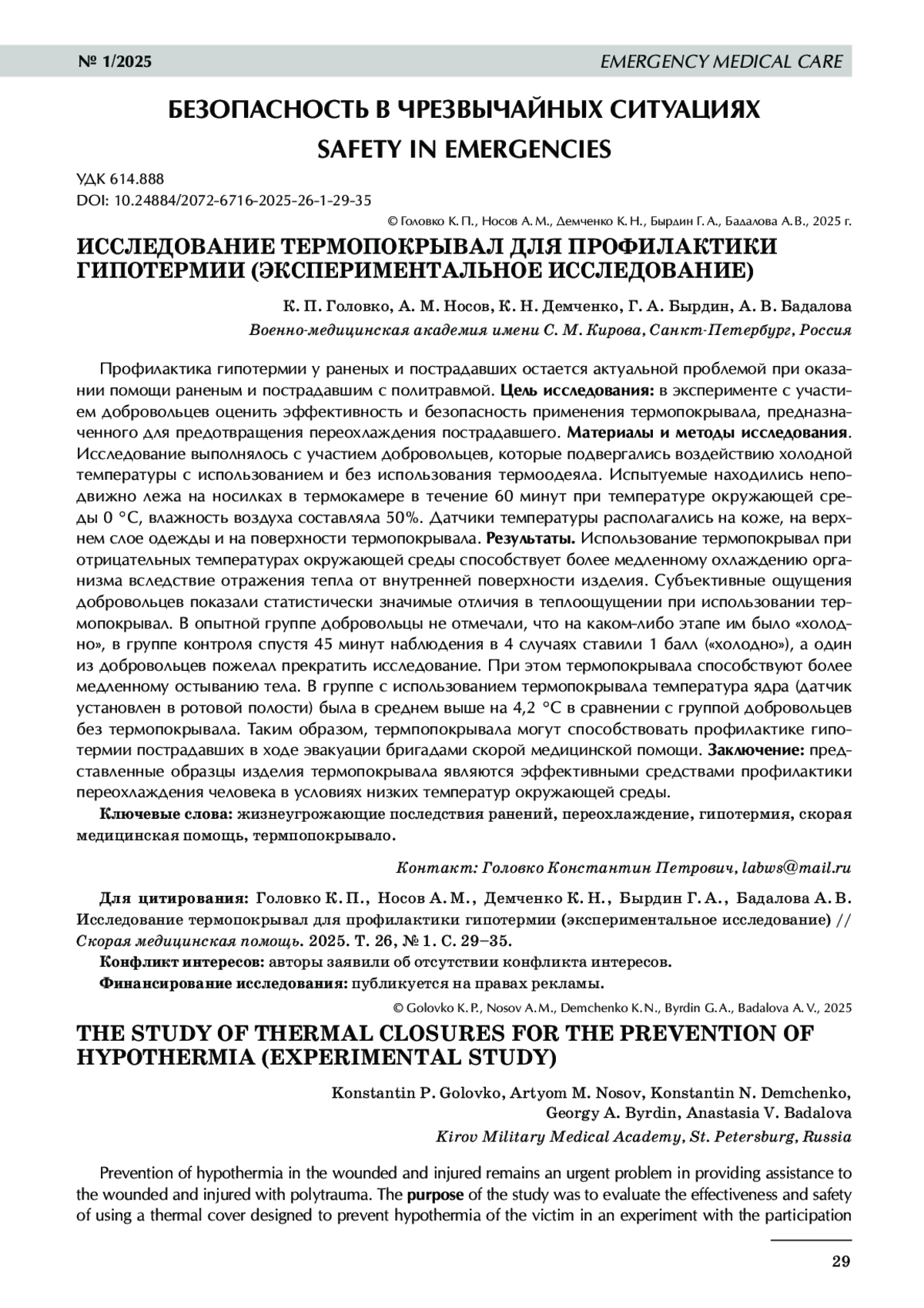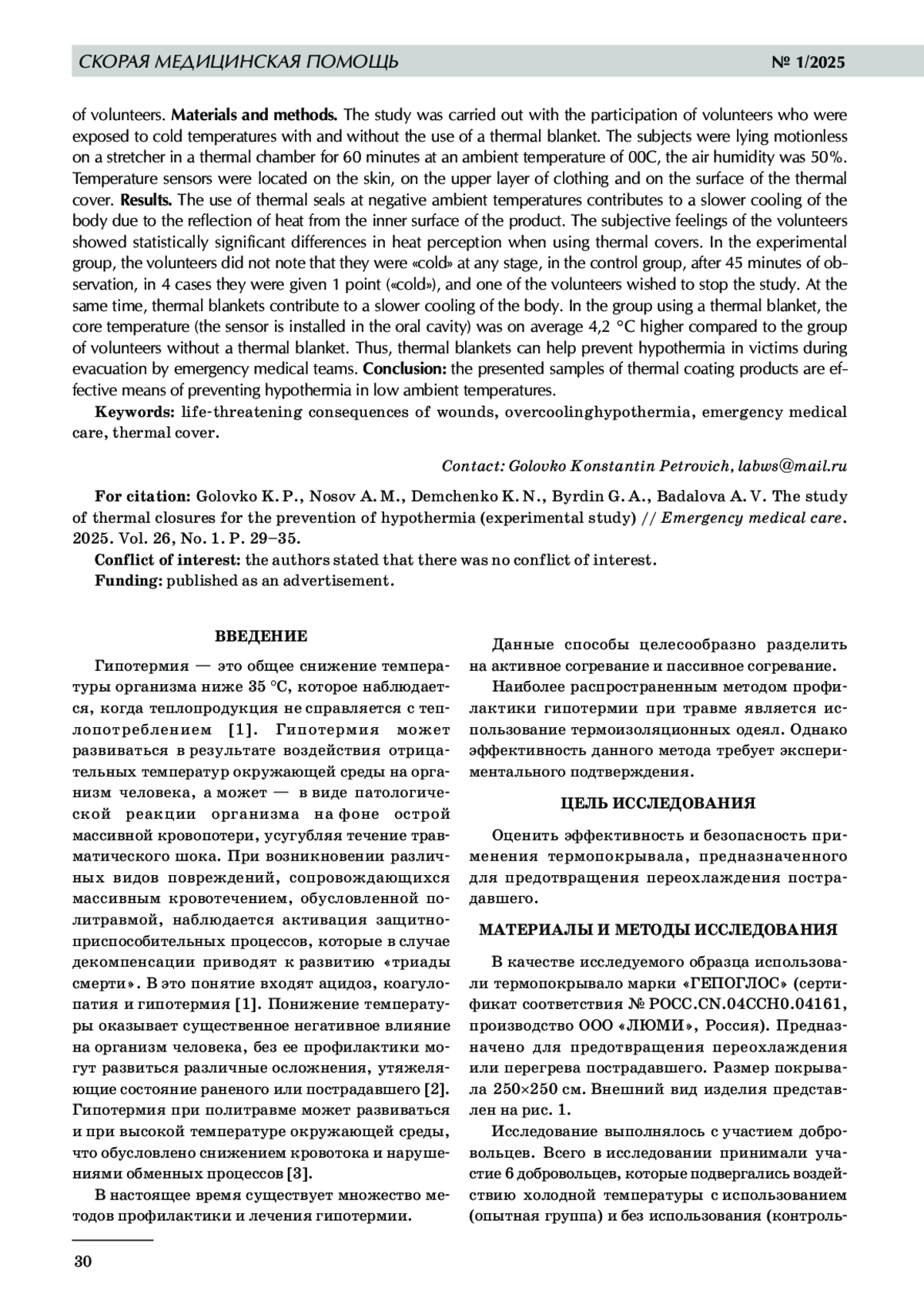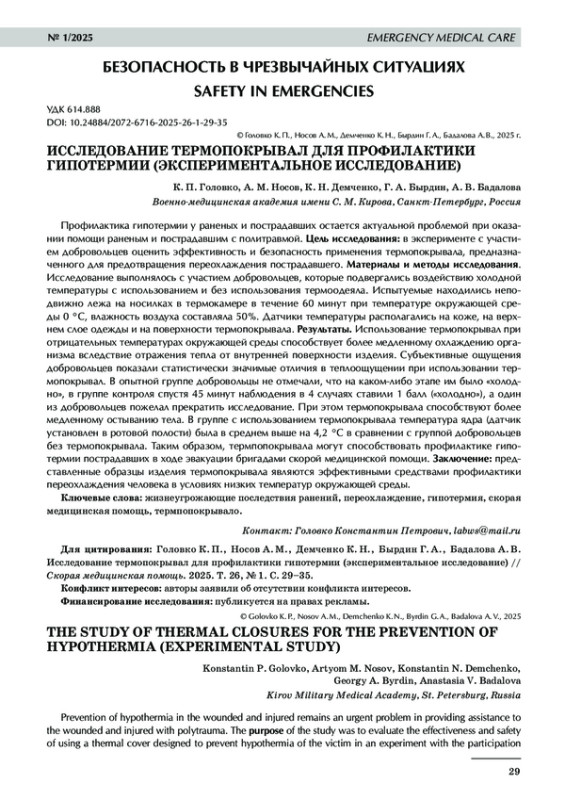Профилактика гипотермии у раненых и пострадавших остается актуальной проблемой при оказании помощи раненым и пострадавшим с политравмой. Цель исследования: в эксперименте с участием добровольцев оценить эффективность и безопасность применения термопокрывала, предназначенного для предотвращения переохлаждения пострадавшего. Материалы и методы исследования. Исследование выполнялось с участием добровольцев, которые подвергались воздействию холодной температуры с использованием и без использования термоодеяла. Испытуемые находились неподвижно лежа на носилках в термокамере в течение 60 минут при температуре окружающей среды 0 °C, влажность воздуха составляла 50%. Датчики температуры располагались на коже, на верхнем слое одежды и на поверхности термопокрывала. Результаты. Использование термопокрывал при отрицательных температурах окружающей среды способствует более медленному охлаждению организма вследствие отражения тепла от внутренней поверхности изделия. Субъективные ощущения добровольцев показали статистически значимые отличия в теплоощущении при использовании термопокрывал. В опытной группе добровольцы не отмечали, что на каком‑либо этапе им было «холодно», в группе контроля спустя 45 минут наблюдения в 4 случаях ставили 1 балл («холодно»), а один из добровольцев пожелал прекратить исследование. При этом термопокрывала способствуют более медленному остыванию тела. В группе с использованием термопокрывала температура ядра (датчик установлен в ротовой полости) была в среднем выше на 4,2 °C в сравнении с группой добровольцев без термопокрывала. Таким образом, термпопокрывала могут способствовать профилактике гипотермии пострадавших в ходе эвакуации бригадами скорой медицинской помощи. Заключение: представленные образцы изделия термопокрывала являются эффективными средствами профилактики переохлаждения человека в условиях низких температур окружающей среды.